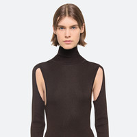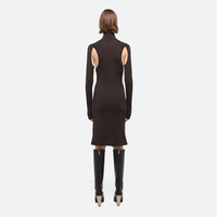 Fine-gauge turtleneck sweater dress in a viscose knit with a subtle sheen. Slim fit with underarms cutouts finished with clean self knit trims. Fits true to size. Model is 5'9.5" and wears size S DETAILS - Turtleneck - Long sleeves - Underarm cutouts - Knee length - Fully fashioned for a clean finish - O06HW704 MATERIALS & CARE - Composition: 80% Viscose, 18% Nylon, 2% Elastane - Professional dry clean with petroleum solvent only. - Finished Garment Manufacturing Country/Region: China - Fabric Production Country/Region: China - Dyeing Country/Region: (of fabric) China - Finishing Country/Region: (of fabric) China - Spinning: (of fabric) China
