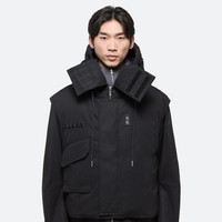 Layered puffer jacket with funnel neck and hood. Wear the removable vest on its own, opening the side zippers for lighter protection. Utility pockets and functional details pulled from aviation suits and naval gear create endless ways to layer and style. Winter-ready with a naturally water-resistant and windproof woven cotton shell, down quilting, and an oversized fit. Fits true to size. Model is 6’2” and wears size M DETAILS - Two pieces can be worn separately or together - Front zip closure with storm guard - Hood with drawstring - Funnel neck with velcro closure - Lace-up detailing at sides - Windproof and water resistant shell - Quilted throughout with down fill - O07HM402 MATERIALS & CARE - Composition: 100% Cotton - Professional dry clean only - Finished Garment Manufacturing Country/Region: China - Fabric Production Country/Region: Italy - Weaving Country/Region: (of fabric) Turkey - Dyeing Country/Region: (of fabric) Italy - Finishing Country/Region: (of fabric) Italy