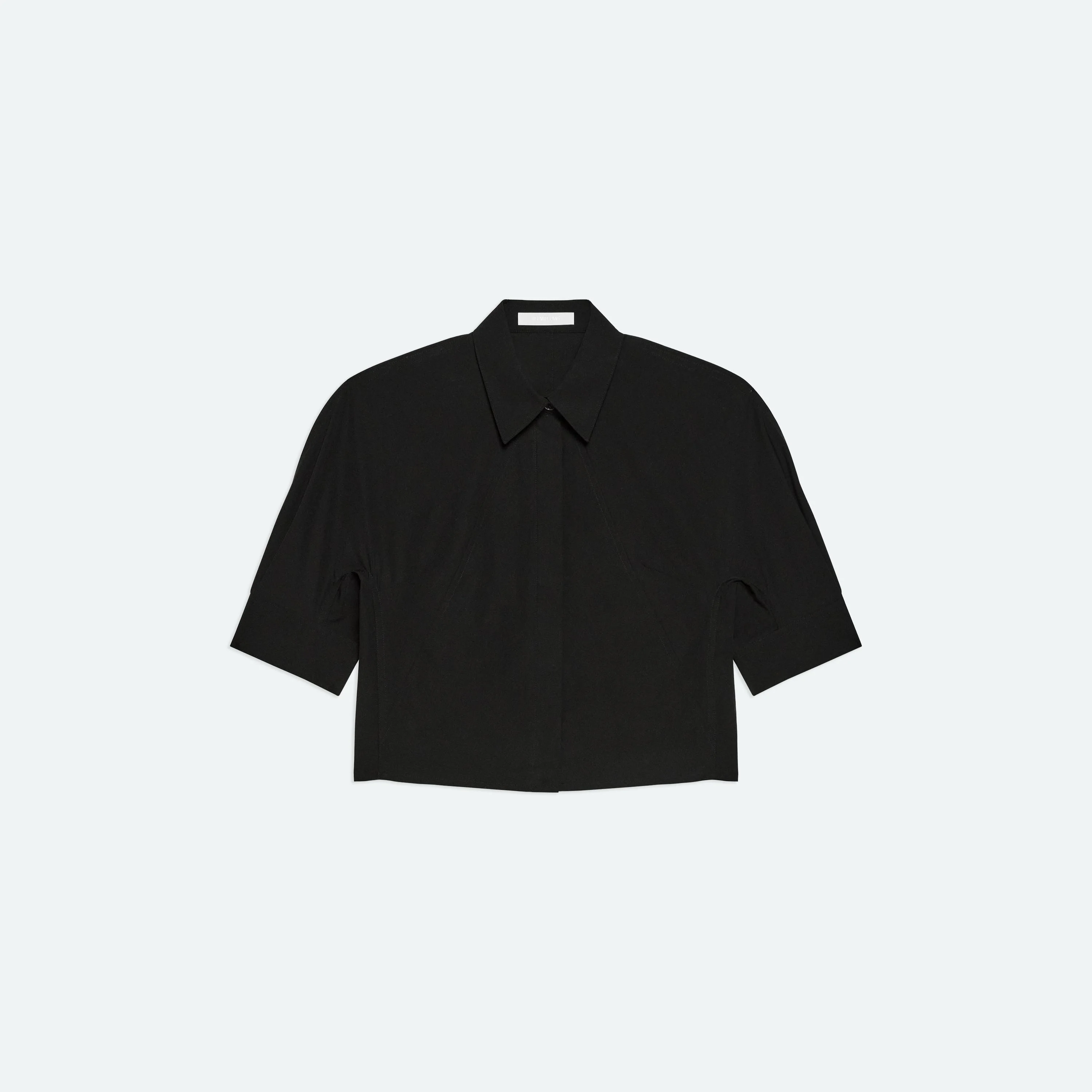 Cotton poplin shirt with exaggerated sleeves. Inspired by vintage parachute designs, with articulated seams that create a rounded shoulder and a fitted waist. Fits true to size. Model is 5’11” and wears size S. DETAILS - Pointed collar - Elbow-length sleeves - Cropped length - Hidden button front closure - Metal-wrapped logo buttons - Tonal rubber logo patch at back - P01HW504 MATERIALS & CARE - Composition: 100% Cotton - Professional dry clean only - Finished Garment Manufacturing Country/Region: Vietnam - Fabric Production Country/Region: Japan - Weaving Country/Region: (of fabric) Japan - Dyeing Country/Region: (of fabric) Japan - Finishing Country/Region: (of fabric) Japan