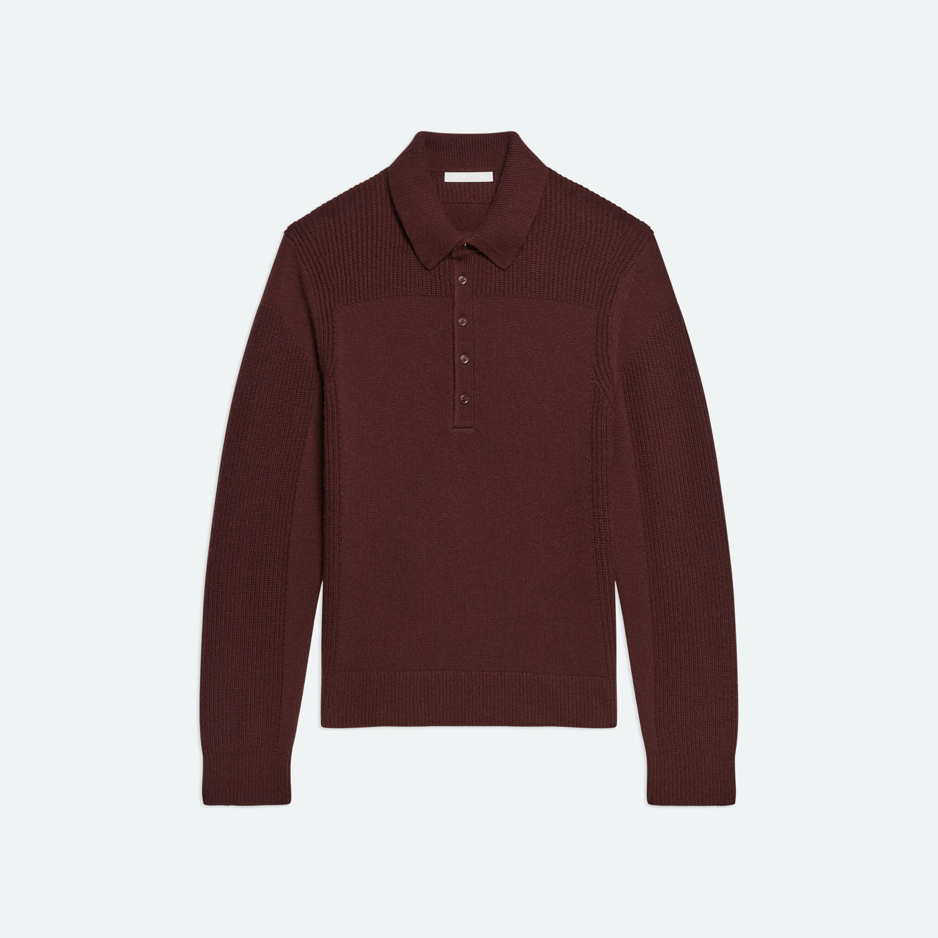 Midweight polo sweater with contrasting shoulder detail. Finished with an elongated placket and metal-wrapped buttons. Fits true to size. Model is 6’2” and wears size M. DETAILS - Polo neck with button closure - Contrasting knit detail on shoulders, sleeves, and sides - Ribbed collar, hem, and cuffs - Leather logo patch at back - Straight fit - P06HM703 MATERIALS & CARE - Composition: 70% wool, 30% cashmere - Dry clean with any solvent except trichloroethylene. - Fabric Production Country/Region: China - Dyeing Country/Region: (of fabric) China - Finishing Country/Region: (of fabric) China - Spinning: (of fabric) China