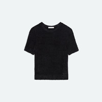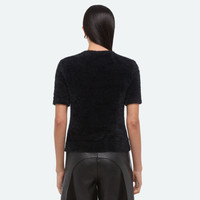 Knit baby tee in a feathery eyelash knit. Matches the Sweater Mini Skirt. BLACK: Fits true to size. Model is 5'11” and wears size S. WHITE: Fits true to size. Model is 5'11" and wears size S. RED: Fits true to size. Model is 5'10" and wears size S. DETAILS - Eyelash knit - Crewneck - Ribbed hem and cuffs - Slim fit - P07HW709 MATERIALS & CARE - Composition: 100% nylon - Dry clean with any solvent except trichloroethylene. - Finished Garment Manufacturing Country/Region: China - Fabric Production Country/Region: China - Dyeing Country/Region: (of fabric) China - Finishing Country/Region: (of fabric) China - Spinning: (of fabric) China