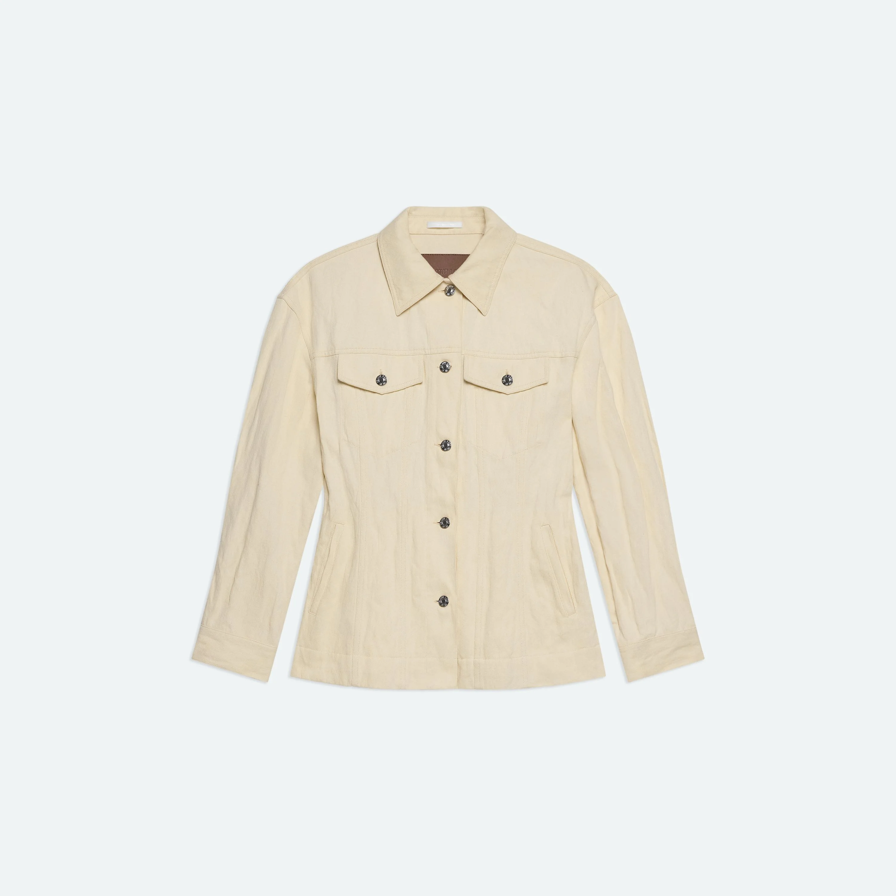 A twist on the traditional trucker jacket in an ecru cotton twill woven with fine metal filaments, creating a dynamic texture that holds its shape when crushed. Fits true to size. Model is 5'9" and wears size S. DETAILS - Metal button front closure - Front flap pockets with button closure - Metal button cuffs - Welt pockets on sides - Hip length - Q02HW101 MATERIALS & CARE - Composition: 91% cotton, 9% metallic yarn - Machine wash cold, gentle cycle, with like colors. Do not bleach. Lay flat to dry in shade. Cool iron if needed, or dry clean. Do not tumble dry. - Finished Garment Manufacturing Country/Region: Vietnam - Fabric Production Country/Region: Italy - Weaving Country/Region: (of fabric) Italy - Dyeing Country/Region: (of fabric) Italy - Finishing Country/Region: (of fabric) Italy