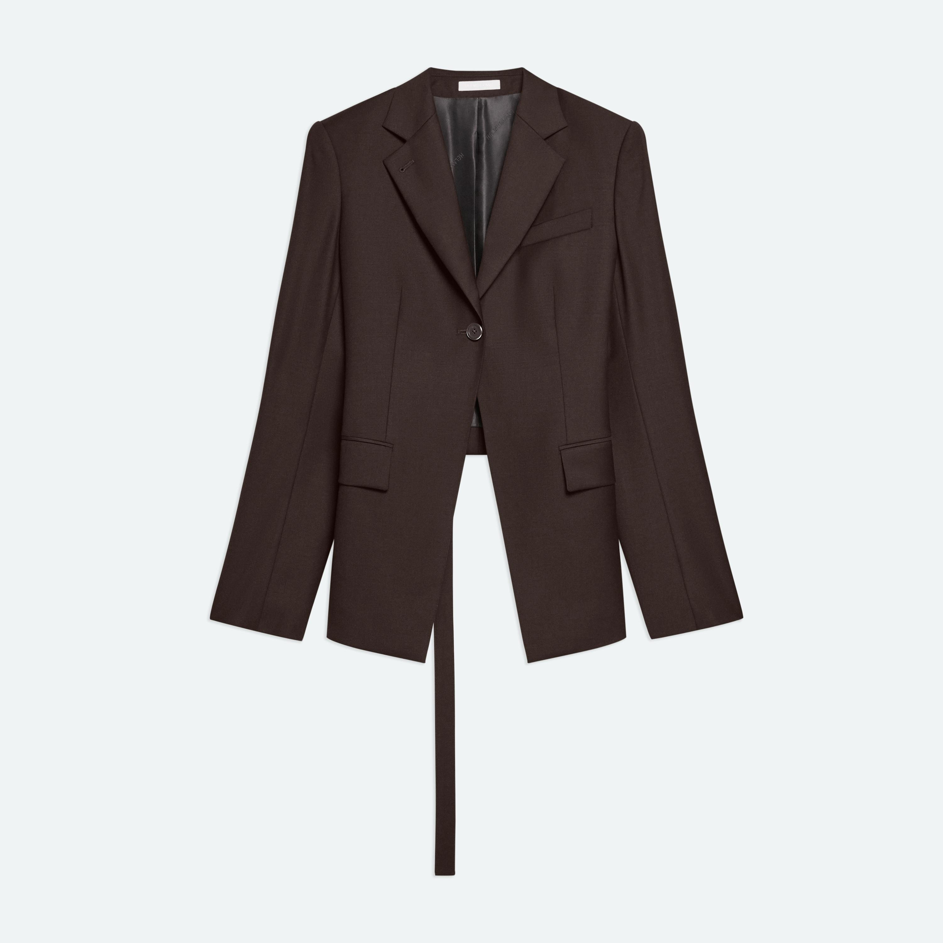 Tailored wool jacket with structured shoulders and cutaway front. Cinch the back waist belt for an exaggerated fit. Matches the Relaxed Cargo Trouser. Fits true to size. Model is 5'11" and wears size 2. DETAILS - Notched lapels - Flap pockets - Front welt pocket - Single button front closure - Adjustable waistcoat belt at back - Slim fit - Fully lined - P06HW101 MATERIALS & CARE - Composition: 100% wool; lining: 100% viscose - Professional dry clean only. - Finished Garment Manufacturing Country/Region: Vietnam - Fabric Production Country/Region: China - Weaving Country/Region: (of fabric) China - Dyeing Country/Region: (of fabric) China - Finishing Country/Region: (of fabric) China