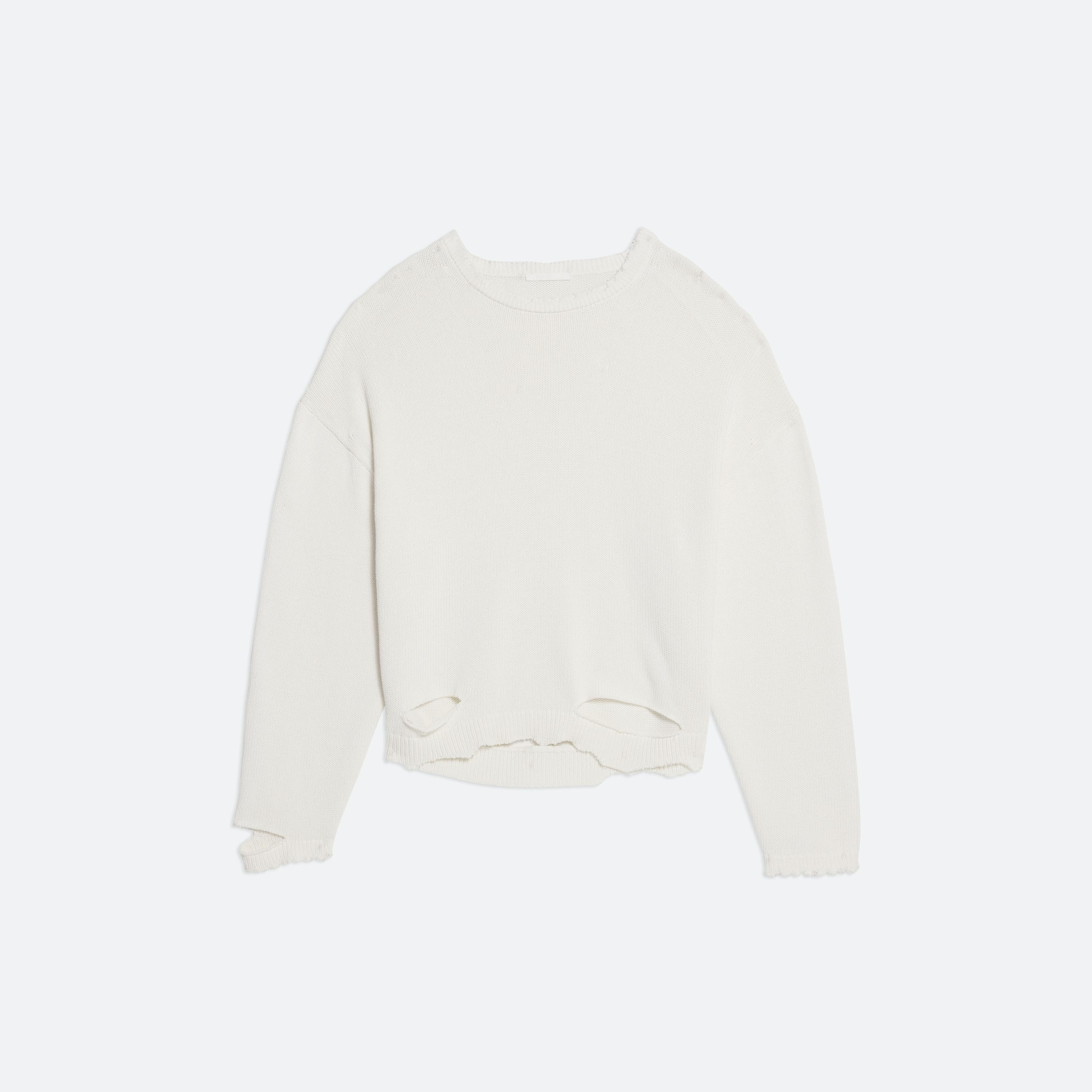 Ribbed sweater in bouncy Italian cotton knit. A roomy fit, dropped shoulder, and distressed detailing create the feeling of a long-time favorite. This garment was designed with a unisex fit so you can express your unique style. Fits true to size. Male model is 6’2” and is wearing size M Female model is 5’9” and is wearing size S DETAILS - Crewneck - Cotton rib-effect knit - Ribbed cuffs and hem - Distressed detail at neck, cuffs, and hem - Boxy, oversized fit - O04HM799 MATERIALS & CARE - Composition: 99% Cotton, 1% Other Fibers - Dry clean using any solvent except trichloroethylene. - Finished Garment Manufacturing Country/Region: China - Fabric Production Country/Region: Italy - Dyeing Country/Region: (of fabric) Italy - Finishing Country/Region: (of fabric) Italy - Spinning: (of fabric) Italy