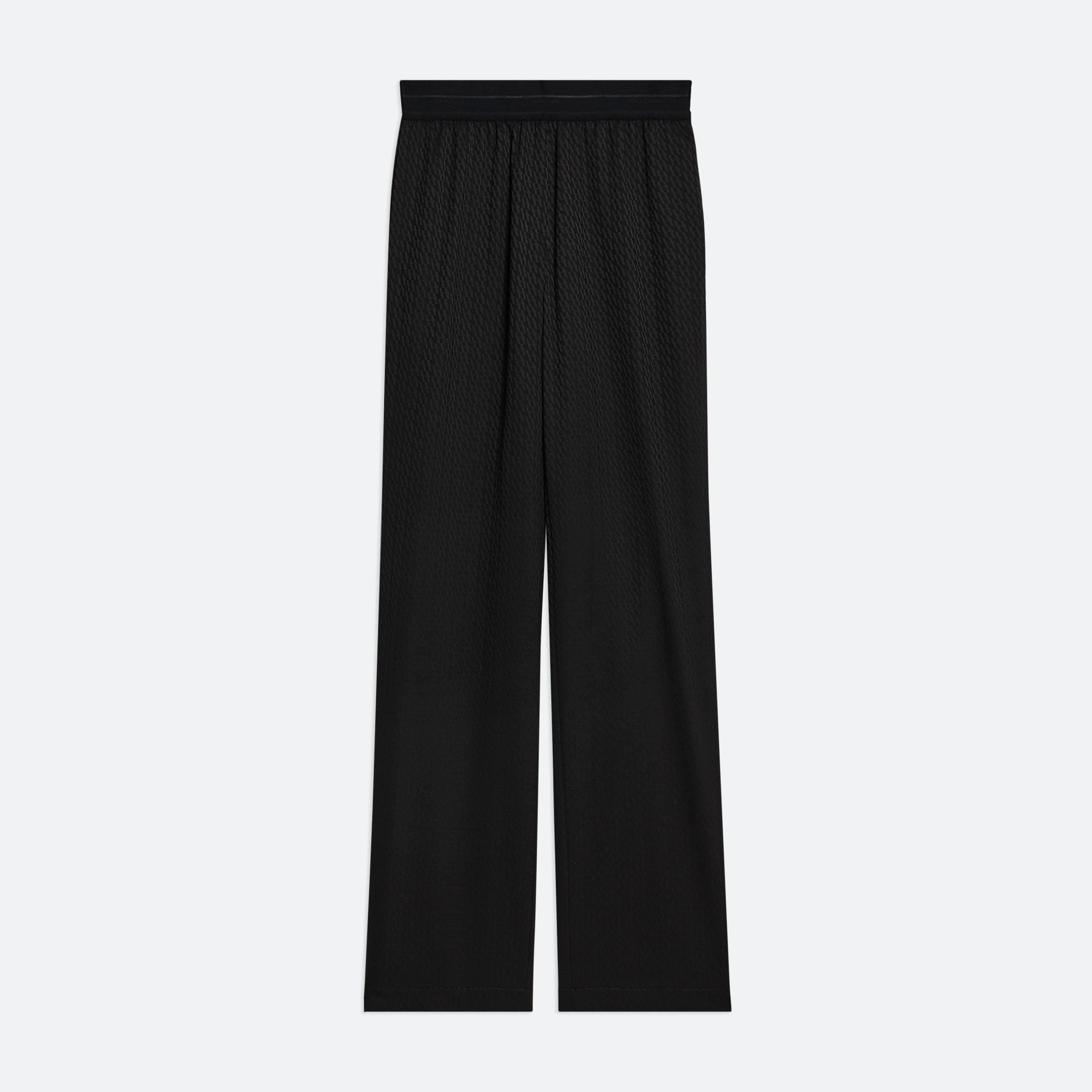 Tailored pull-on trousers in satin logo jacquard, with a straight leg and hidden side pockets. Matches the Modest Jacquard Vest . Fits true to size. Model is 6’1” and wears size 2. DETAILS - Flat knit waistband - Flange along side seams - Slip pockets on sides - Welt back pockets with metal logo clip - Mid-rise - 33 1/2” inseam and 19” leg opening - O10HW202 MATERIALS & CARE - Composition: 73% Polyester, 25% Wool, 2% Elastane - Professional dry clean only. - Finished Garment Manufacturing Country/Region: China - Fabric Production Country/Region: Turkey - Weaving Country/Region: (of fabric) Turkey - Dyeing Country/Region: (of fabric) Turkey - Finishing Country/Region: (of fabric) Turkey