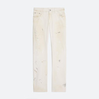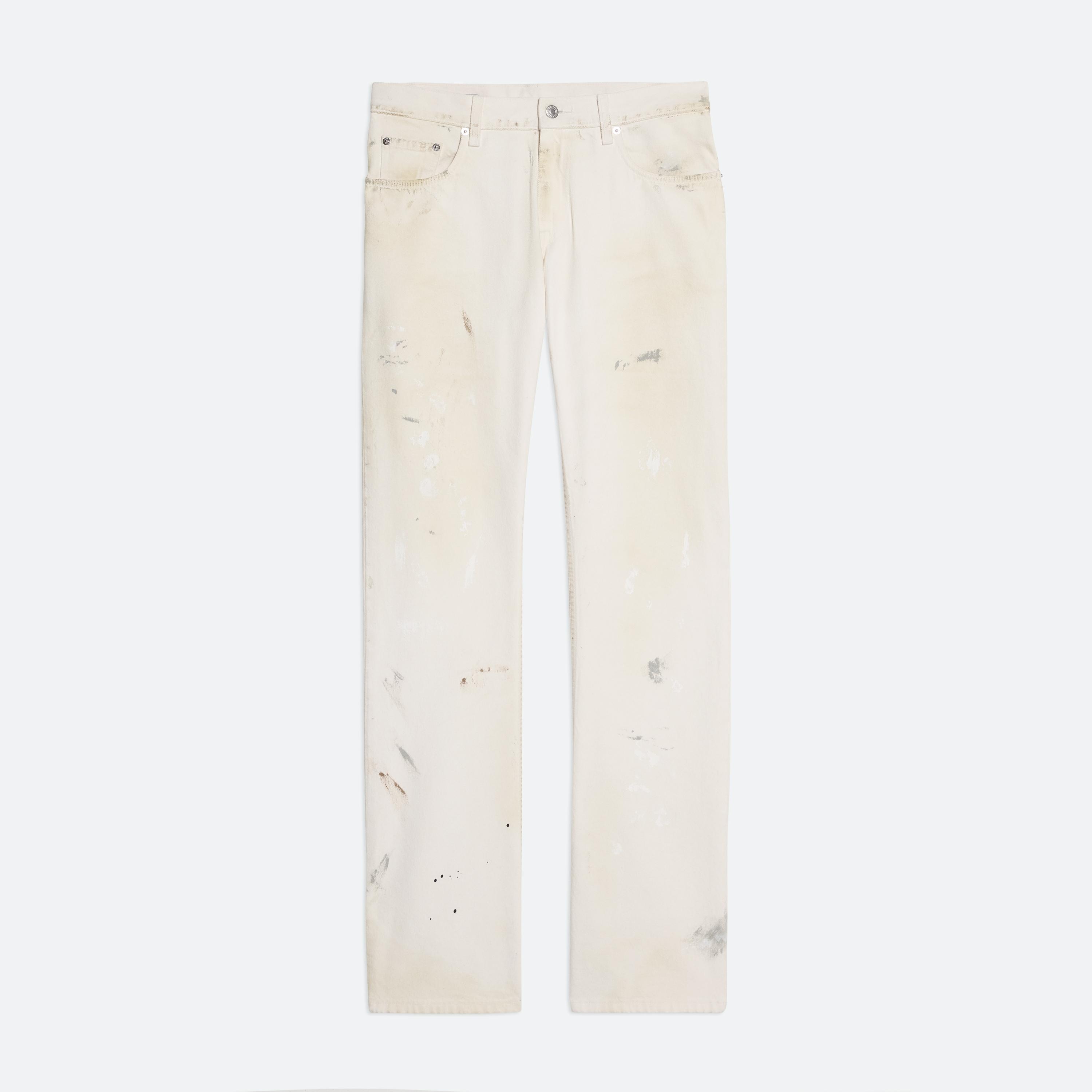 Low-rise five-pocket jeans in undyed denim. Cut with an easy, relaxed fit and a straight leg. Each pair is finished by hand with paint and oil staining for a one-of-a-kind patina. Fits true to size. Model is 6’2” and is wearing size 32 DETAILS - Low-rise - Straight leg - Relaxed fit - Hand-painted detailing - Zip fly with button closure - Classic five-pocket style - Belt loops - Riveted metal logo plate at back - 100% cotton denim - O05DM201 MATERIALS & CARE - Composition: 100% Cotton - Machine wash cold with like colors. Do not bleach. - Do not tumble dry. Lay flat to dry. Cool iron if needed. - Do not dry clean. - Finished Garment Manufacturing Country/Region: United States - Fabric Production Country/Region: Italy - Weaving Country/Region: (of fabric) Italy - Dyeing Country/Region: (of fabric) Italy - Finishing Country/Region: (of fabric) Italy