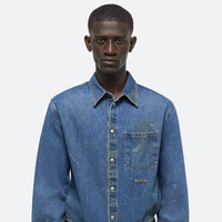 Classic shirt with snap closures in mid-wash cotton denim. Each shirt is finished by hand with paint and oil staining for a one-of-a-kind patina. Fits true to size. Model is 6’1” and is wearing size 40 DETAILS - Pointed collar - Patch pocket - Hand-painted detailing - Snap front closure and cuffs - Mid-wash cotton denim with classic finishes - Shirttail hem - Oversized fit - Riveted metal logo plate at back - O04DM103 MATERIALS & CARE - Composition: 100% Cotton - Machine wash cold with like colors. Do not bleach. Do not tumble dry. - Lay flat to dry. Cool iron if needed. Do not dry clean. - Finished Garment Manufacturing Country/Region: China - Fabric Production Country/Region: Italy - Weaving Country/Region: (of fabric) Italy - Dyeing Country/Region: (of fabric) Italy - Finishing Country/Region: (of fabric) Italy