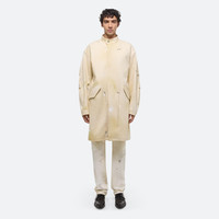 Raw undyed denim jacket with classic parka details like a fishtail hem and drawstring waist. Adjustable straps inside allow the coat to be worn over the shoulders like a backpack. Each jacket is finished by hand with paint and oil staining for a one-of-a-kind patina. Fits true to size. Model is 6’2” and is wearing size M DETAILS - Undyed raw denim - Hand-painted detailing - Zipper closure with hidden snaps - Adjustable interior straps - Snap pockets - Drawstring at waist - Adjustable cuffs - Fishtail hem with snap detail - Riveted metal logo plate at back - O05DM499 MATERIALS & CARE - Composition: 100% Cotton - Machine wash cold with like colors. Do not bleach. - Do not tumble dry. - Lay flat to dry. Cool iron if needed. Do not dry clean. - Finished Garment Manufacturing Country/Region: China - Fabric Production Country/Region: Italy - Weaving Country/Region: (of fabric) Italy - Dyeing Country/Region: (of fabric) Italy - Finishing Country/Region: (of fabric) Italy