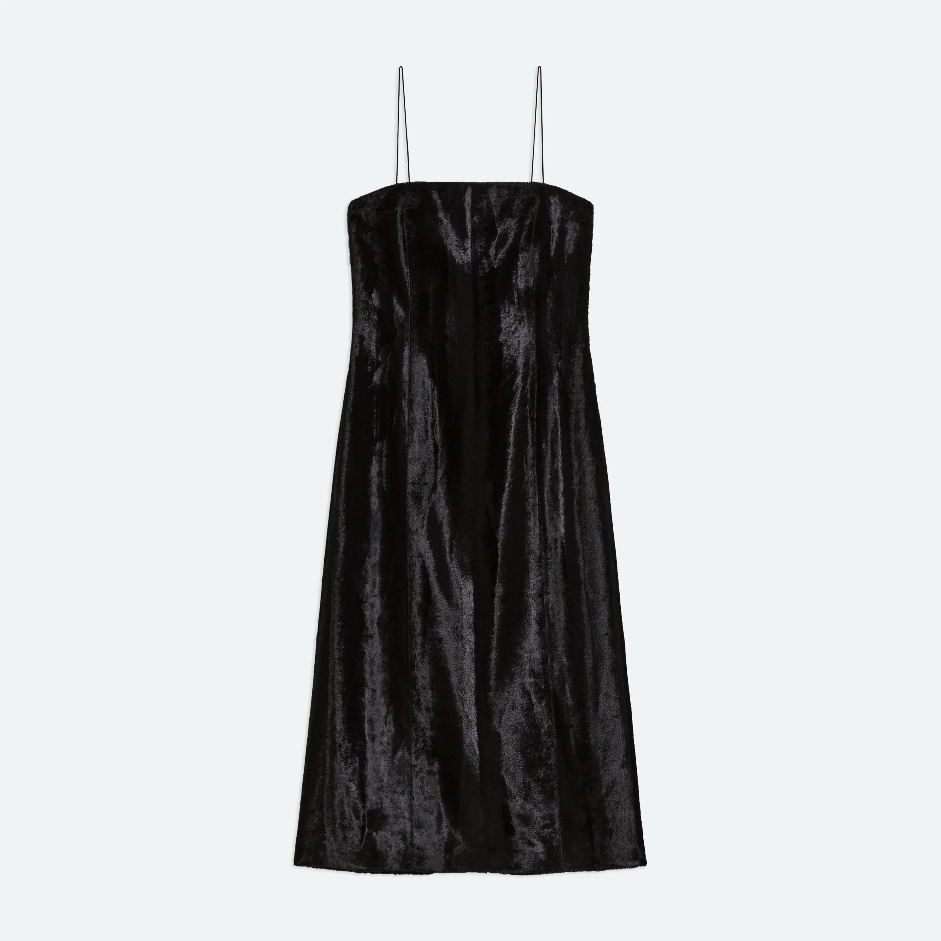 Fitted midi dress in textured faux pony hide. Fits true to size. Model is 5'11" and wears size 2. DETAILS - Removable straps - Side zipper closure - Slit at back - Semi-structured fit - Midi length - Fully lined - P09HW601 MATERIALS & CARE - Composition: 72% rayon, 28% cotton; lining: 100% viscose - Professional dry clean only. Do not steam. - Fabric Production Country/Region: United States - Weaving Country/Region: (of fabric) Japan - Dyeing Country/Region: (of fabric) Japan - Finishing Country/Region: (of fabric) Japan