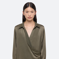 Wrap-front shirt in a fluid satin crepe. Adjust the depth of the wrap to control the amount of coverage, wear as a cowl neck, or leave open for a draped look. Fits true to size. Model is 5’11” and wears size S. DETAILS - Pointed collar - Buttons at side and collar for adjustable fit - Tuxedo cuffs - Relaxed fit - O09HW501 MATERIALS & CARE - Composition: 82% Triacetate, 18% Polyester - Professional dry clean only. Cool iron and light steam if needed light steam. - Finished Garment Manufacturing Country/Region: China - Fabric Production Country/Region: Japan - Weaving Country/Region: (of fabric) Japan - Dyeing Country/Region: (of fabric) Japan - Finishing Country/Region: (of fabric) Japan