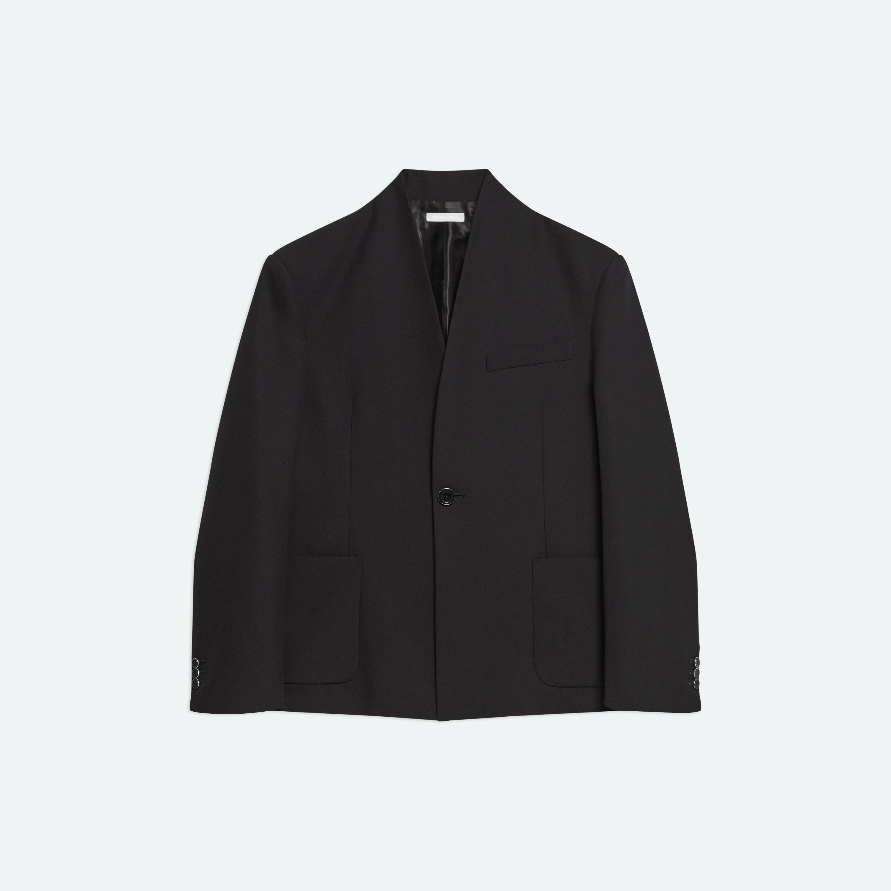 Collarless single-breasted blazer in midweight wool. Cut with a boxy fit. Fits true to size. Model is 6’1” and wears size 42. DETAILS - Clean neckline - Patch pockets - Front welt pocket - Interior welt pocket - Metal-wrapped logo buttons - Vent at back - Relaxed fit - P06HM102 MATERIALS & CARE - Composition: 55% polyester, 45% virgin wool; lining: 100% viscose - Professional dry clean only. - Fabric Production Country/Region: Italy - Weaving Country/Region: (of fabric) Italy - Dyeing Country/Region: (of fabric) Italy - Finishing Country/Region: (of fabric) Italy