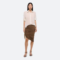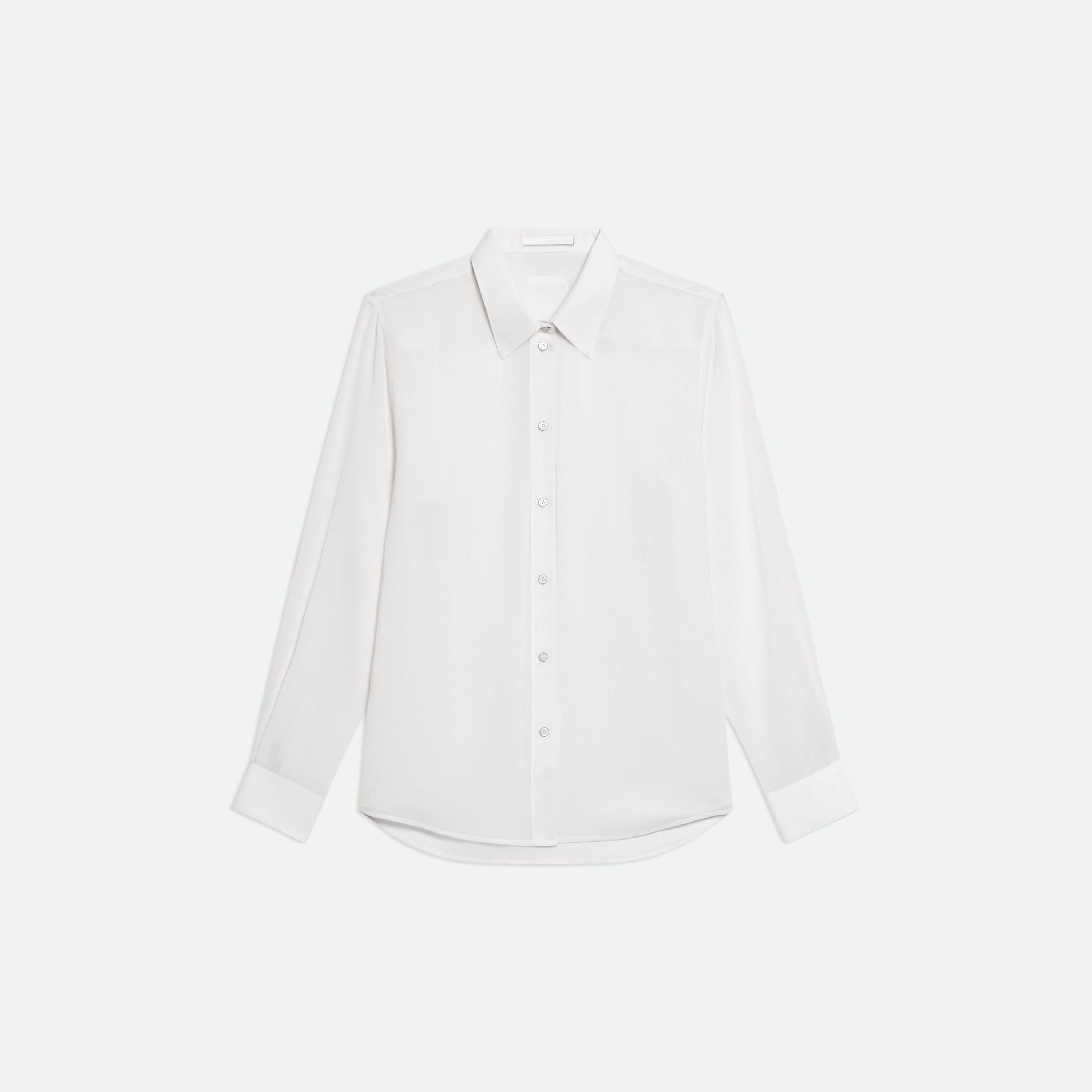 Classic shirt in lightweight wool chiffon. Matches the Sheer Double-Pleated Pants. Fits true to size. Model is 5’11” and wears size S. DETAILS - Pointed collar - Long sleeves - Button front closure and cuffs - Shirttail hem - Metal-wrapped logo buttons - Tonal rubber logo patch at back - P01HW507 MATERIALS & CARE - Composition: 89% wool, 11% polyamide - Do not wash, do not bleach, do not tumble dry, warm iron if needed, dry clean with any solvent except trichloroethylene - Finished Garment Manufacturing Country/Region: China - Fabric Production Country/Region: Turkey - Weaving Country/Region: (of fabric) Turkey - Dyeing Country/Region: (of fabric) Turkey - Finishing Country/Region: (of fabric) Turkey