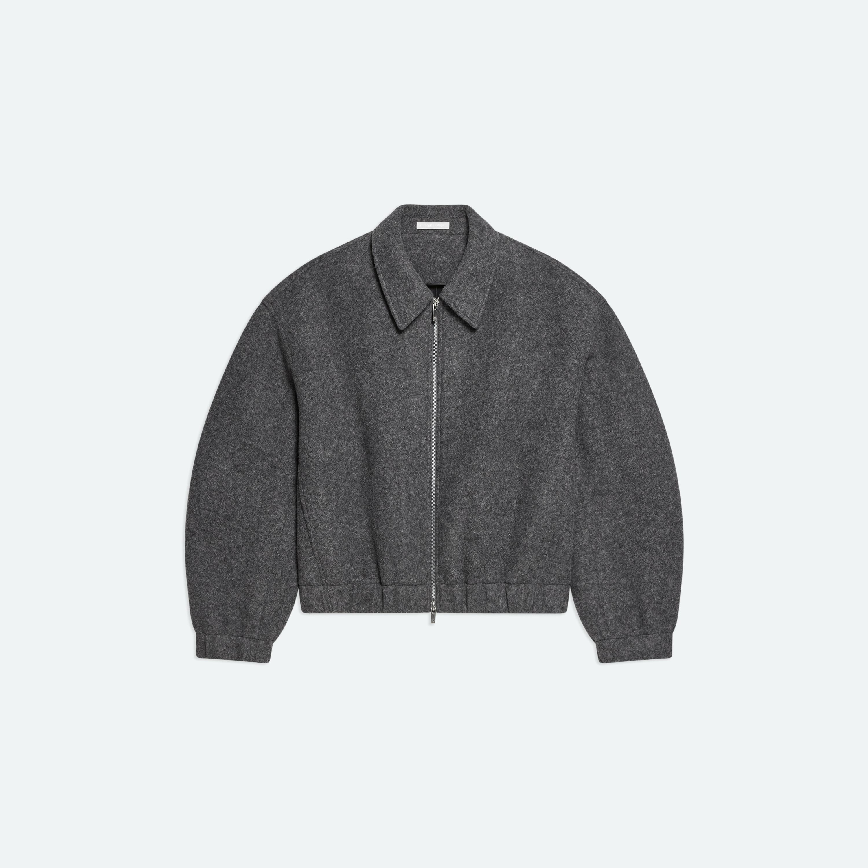Relaxed bomber jacket in a neoprene-bonded wool. Exaggerated sleeves and an elastic hem create a gently rounded silhouette. Fits true to size. Model is 6’2” and wears size M. DETAILS - 2-way front zipper closure - Pointed collar - Elastic hem and cuffs - In-seam pockets - Leather logo patch at back - Relaxed fit - Unlined - P07HM405 MATERIALS & CARE - Composition: 60% polyester, 25% acrylic, 12% wool, 3% elastane - Professional dry clean only. - Fabric Production Country/Region: Italy - Weaving Country/Region: (of fabric) Italy - Dyeing Country/Region: (of fabric) Italy - Finishing Country/Region: (of fabric) Italy
