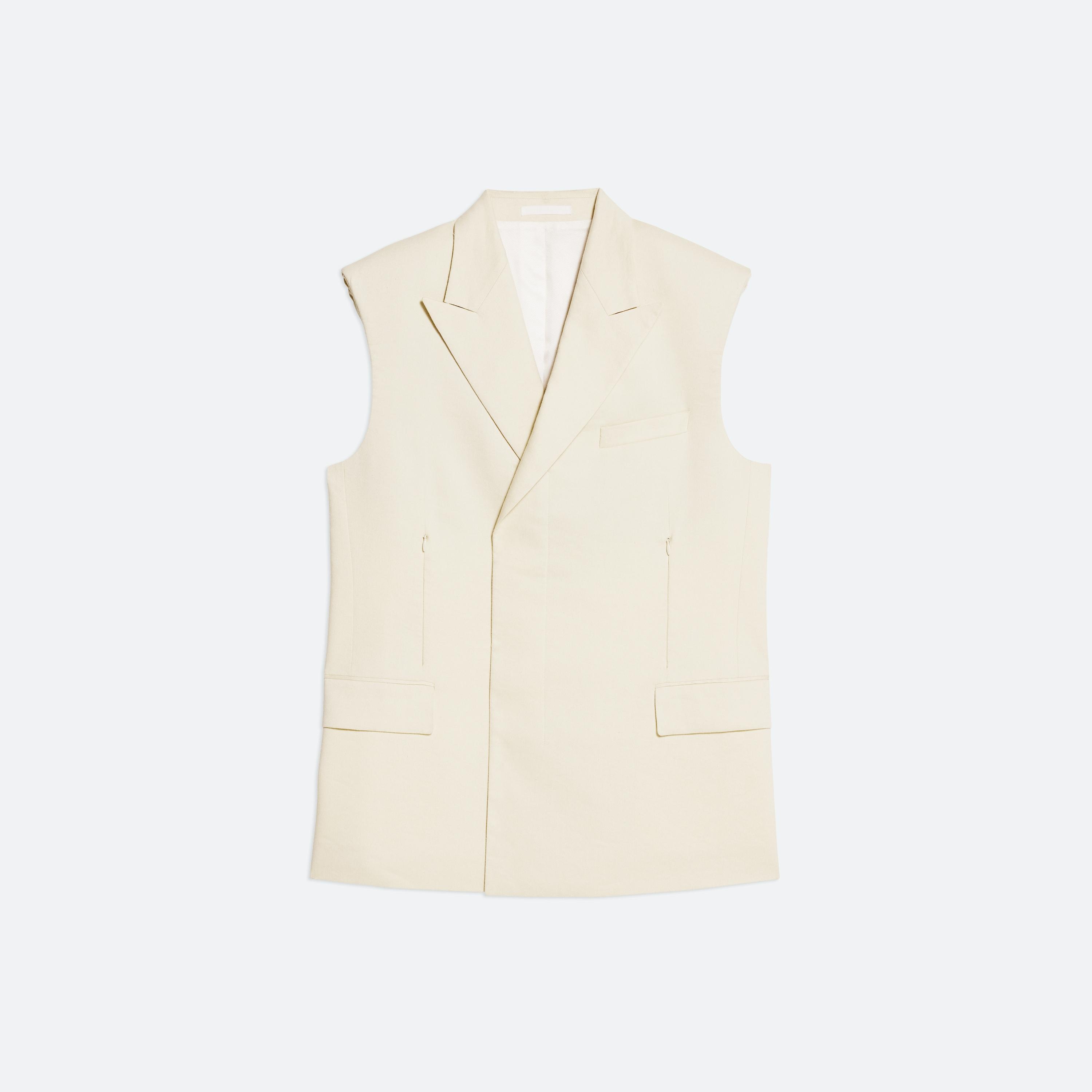 Double-breasted sleeveless blazer in lightweight Italian linen suiting. Relaxed fit with peak lapels, flap pockets, hidden waist pockets, and concealed button closures. This garment was designed with a unisex fit so you can express your unique style. Fits oversized. Female model is 5’11” and is wearing size S Male model is 6’2” and is wearing size M DETAILS - Sleeveless style with padded shoulders - Peak lapels - Flap pockets - Waist pockets with invisible zippers - Interior welt pocket - Vent at back - Relaxed, boxy fit - Fully lined - O04HW199 MATERIALS & CARE - Composition: 52% Linen, 46% Viscose, 2% Elastane - Professional dry clean only. Cool iron if needed. - Finished Garment Manufacturing Country/Region: China - Fabric Production Country/Region: Italy - Weaving Country/Region: (of fabric) Italy - Dyeing Country/Region: (of fabric) Italy - Finishing Country/Region: (of fabric) Italy