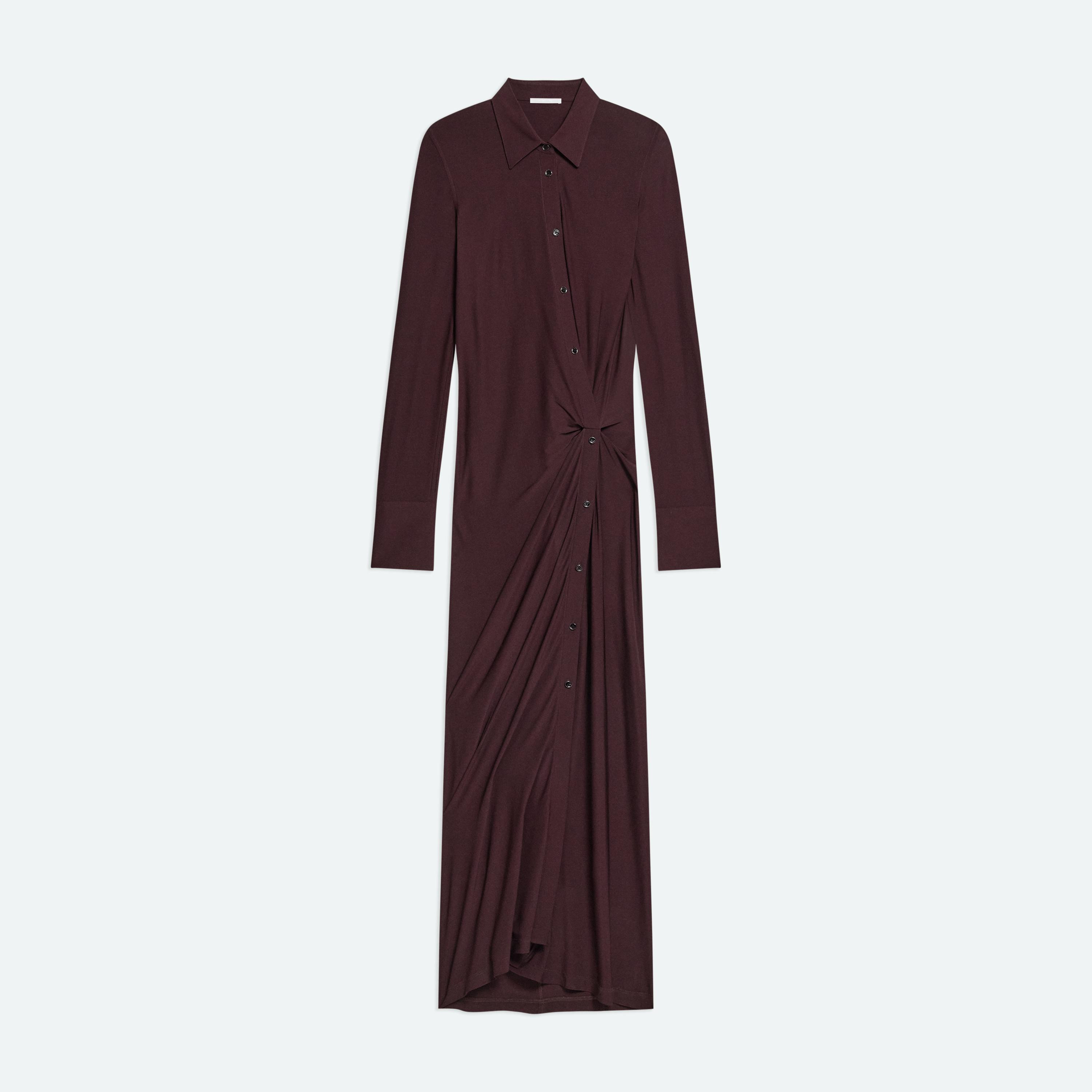 Shirt dress in viscose jersey. An elongated button placket twists around the body for a close fit. Fits true to size. Model is 5'11" and wears size S. DETAILS - Pointed collar - Button front closure and cuffs - High slit - Metal-wrapped logo buttons - Close fit - P10HW602 MATERIALS & CARE - Composition: 95% viscose, 5% elastane - Dry clean with any solvent except trichloroethylene. - Fabric Production Country/Region: China - Weaving Country/Region: (of fabric) China - Dyeing Country/Region: (of fabric) China - Finishing Country/Region: (of fabric) China