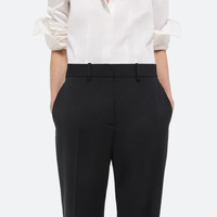 Tailored car trouser in Italian virgin wool. Cut with a relaxed, straight leg fit. Sits low on the waist and pools at the ankles. RUNS LARGE. WE RECOMMEND SIZING DOWN FOR A MORE TAILORED FIT. MODEL IS 6’1” AND IS WEARING SIZE 2 DETAILS - Belt loops - Flat front - Zip fly and hook-and-eye closure - Side slip pockets - Back welt pockets - Relaxed fit - O01HW204 MATERIALS & CARE - Composition: 100% Virgin Wool - Professional dry clean only - Finished Garment Manufacturing Country/Region: China - Fabric Production Country/Region: Italy - Weaving Country/Region: (of fabric) Italy - Dyeing Country/Region: (of fabric) Italy - Finishing Country/Region: (of fabric) Italy