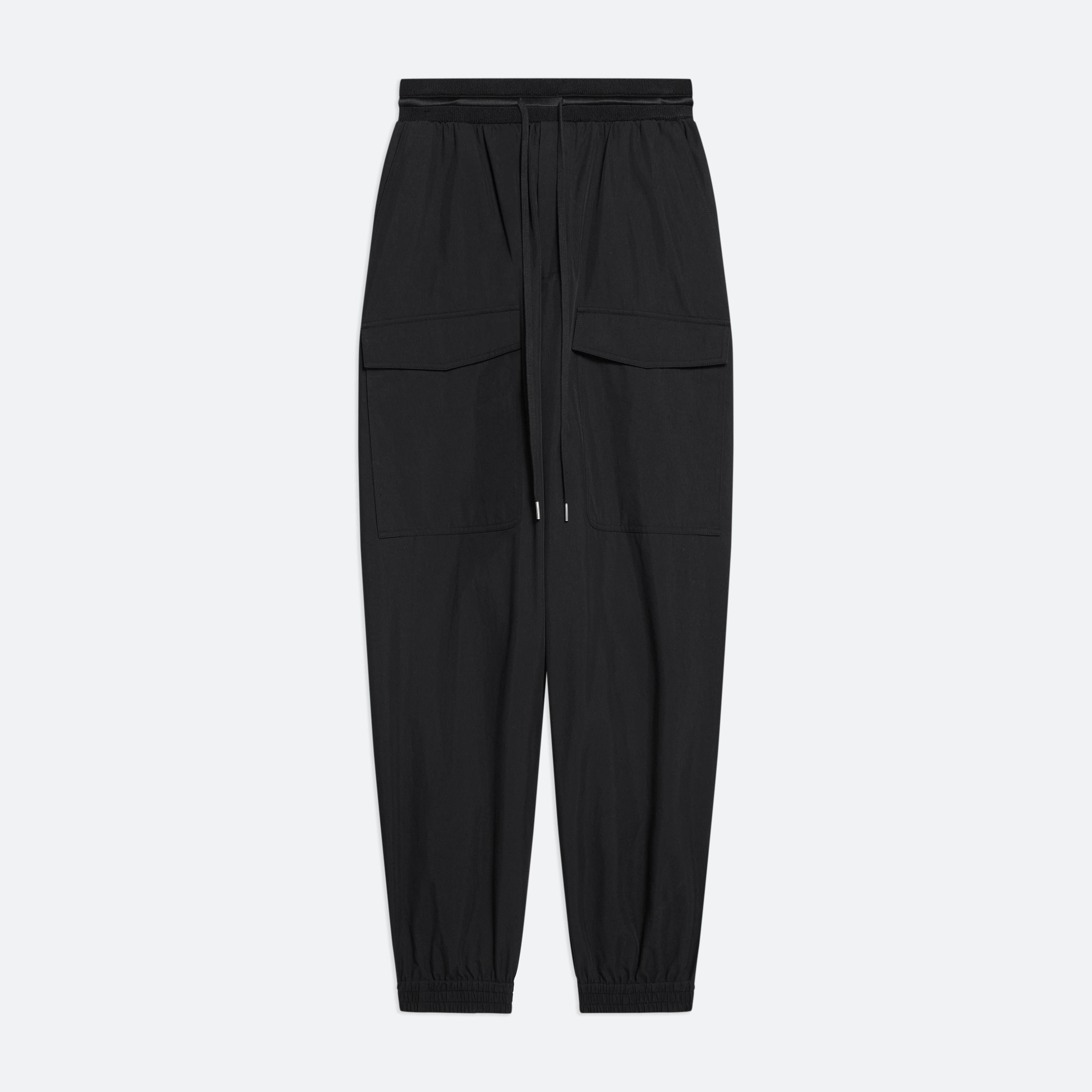 Relaxed pants in crisp cotton-nylon blend with a fuller leg that tapers at the ankle for a slight carrot shape. Features flap pocket detail, a plush knit waistbands, and elastic cuffs. Fits true to size. Model is 5’9” and wears size S DETAILS - Plush elastic waistband with drawstring - Faux fly - Elastic cuffs - Front flap and in-seam pockets - Back patch pockets with metal logo clip - Relaxed fit - O06HW208 MATERIALS & CARE - Composition: 75% Cotton, 25% Nylon - Professional dry clean only. Do not steam. - Finished Garment Manufacturing Country/Region: China - Fabric Production Country/Region: China - Weaving Country/Region: (of fabric) Korea (South) - Dyeing Country/Region: (of fabric) Korea (South) - Finishing Country/Region: (of fabric) Korea (South)