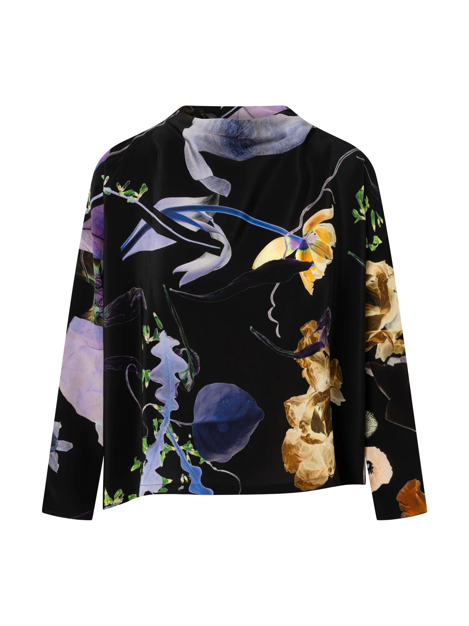 Asymmetric Top in Print 07 from Anntian Highlights - black, purple, beige - dark floral print - long sleeves - high neck - relaxed fit - curved hem - one size Made in Germany Designer ID: 20-02-G Colour ID: Print 07 Materials 100% Silk