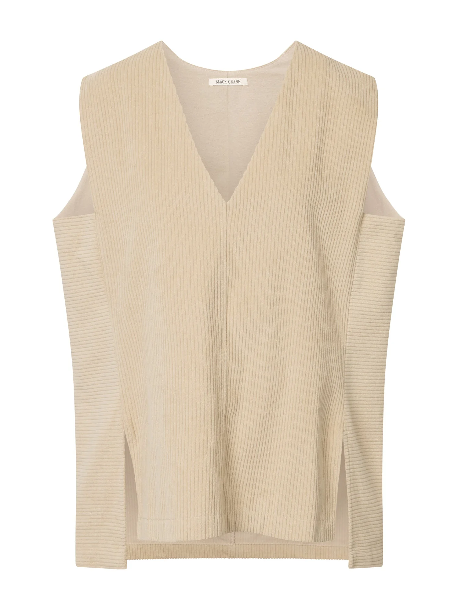 Corduroy Vest in Ivory from Black Crane Highlights - off white - corduroy material - loose fit - no sleeves - v-neck - vest - small side slits Made in USA Designer ID: CR-CDV14 Colour ID: Ivory Materials 100% COTTON CORDUROY/COTTON FLANNEL LINING