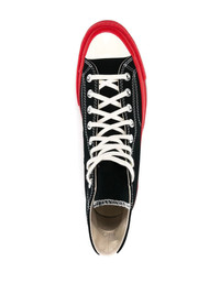 Converse High 'Chuck Taylor' Sneaker Red Sole in Black from Converse x Comme des Garcons PLAY. Highlights - black - red rubber soles - ankle length - white lace closure We recommend sizing down 1 size.Designer ID: P1K124 Materials Body is 100% Cotten, Sole is 100% Rubber Using a damp cloth, rub gently with lukewarm water and mild soap.