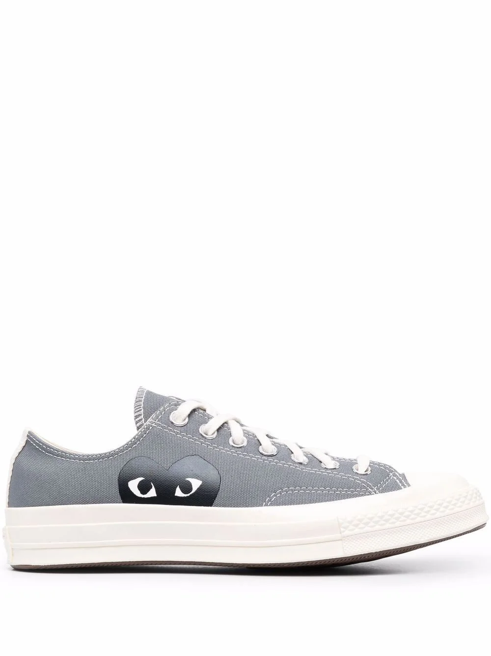 Low Grey Cotton Converse 'Chuck Taylor' Sneakers from Comme Des Garcons Play. Featuring White Rubber Sole, a Contrasting Toe Cap, a Heart Print on the Side and a Lace-Up Front Fastening. We Recommend to Purchase One Size Down. Designer ID: P1K121 Materials Body is 100% Cotten, Sole is 100% Rubber Using a damp cloth, rub gently with lukewarm water and mild soap.