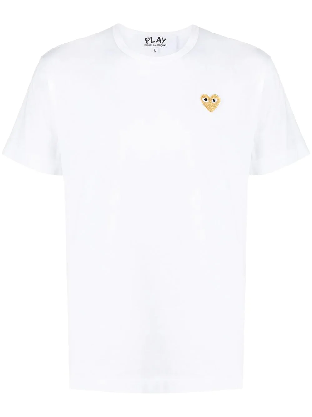 Mens Short Sleeve Gold Heart in White from Comme Des Garcons Play. Highlights: - white - gold heart - round neck - short sleeves This Item runs small - we recommend to go a size up. The model is 1.85 m wearing size L. Made in Japan. Designer ID: P1T216 Colour ID: White Washing: Delicate wash 30C Degrees Materials 100% Cotton Hand Wash / Delicate Machine Wash