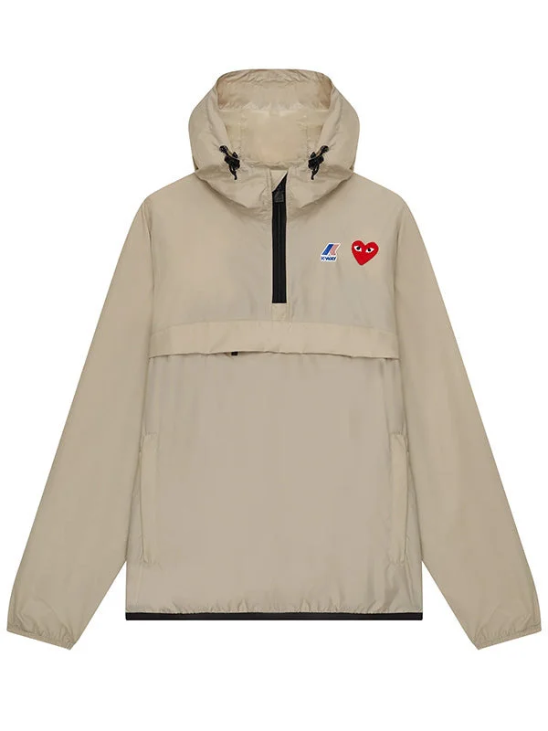 Unisex K-Way Anorak in Beige from Comme des Garcons x K-Way Highlights - beige - zipped up jacket - water resistant - CDG PLAY heart logo - elastic drawcords at the bottom - elastic drawcords on the hoodie - pack away concept - lightweight non-stretch fabric Unisex Style Made in Vietnam Composition: 100% Nylon Designer ID: P1J502 - 3 This unisex piece runs small but is designed for a relaxed fit – take one size up. Please note only one item per customer. Materials 100% Nylon Water Repellent Remove dirt and stains with a wet cloth. Hand Wash Only (if needed)