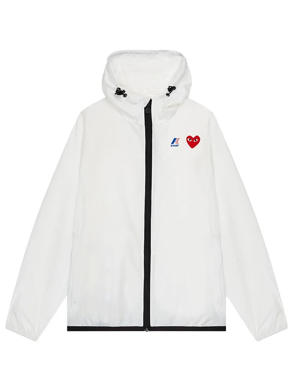 Unisex K-Way Anorak in White from Comme des Garcons x K-Way Highlights - white - zipped up jacket - water resistant - CDG PLAY heart logo - elastic drawcords at the bottom - elastic drawcords on the hoodie - pack away concept - lightweight non-stretch fabric Unisex Style Made in Vietnam Composition: 100% Nylon Designer ID: P1J501 - 3 This unisex piece runs small but is designed for a relaxed fit – take one size up. Please note only one item per customer. Materials 100% Nylon Water Repellent Remove dirt and stains with a wet cloth. Hand Wash Only (if needed)