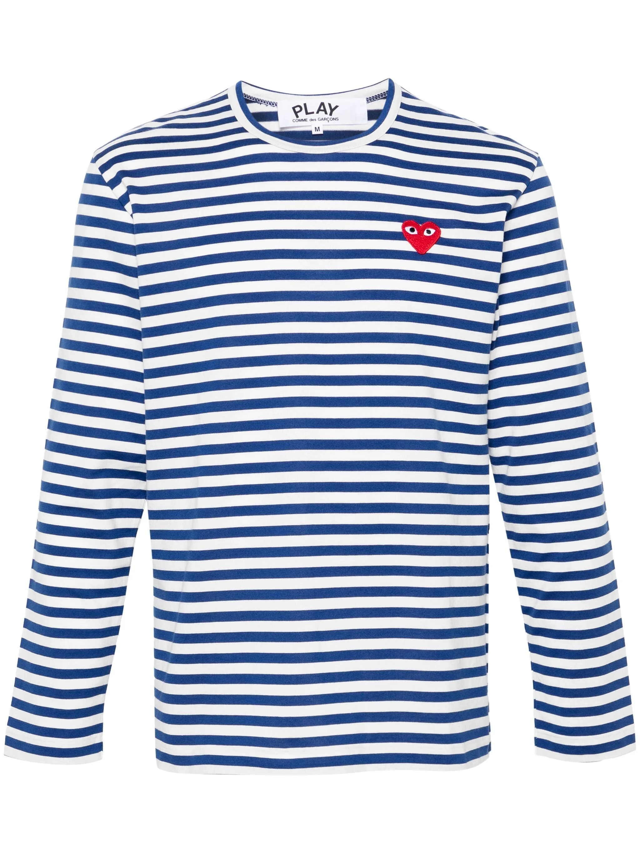 Unisex Striped Tee Red Heart in Navy from Comme des Garcons Play Highlights - navy and white - stripes - unisex - roundneck - red embroidered heart logo - long sleeves - straight hem Made in Japan Designer ID: AX-T164-051 Colour ID: 02 NAVY Materials 100% Cotton Delicate Machine Wash