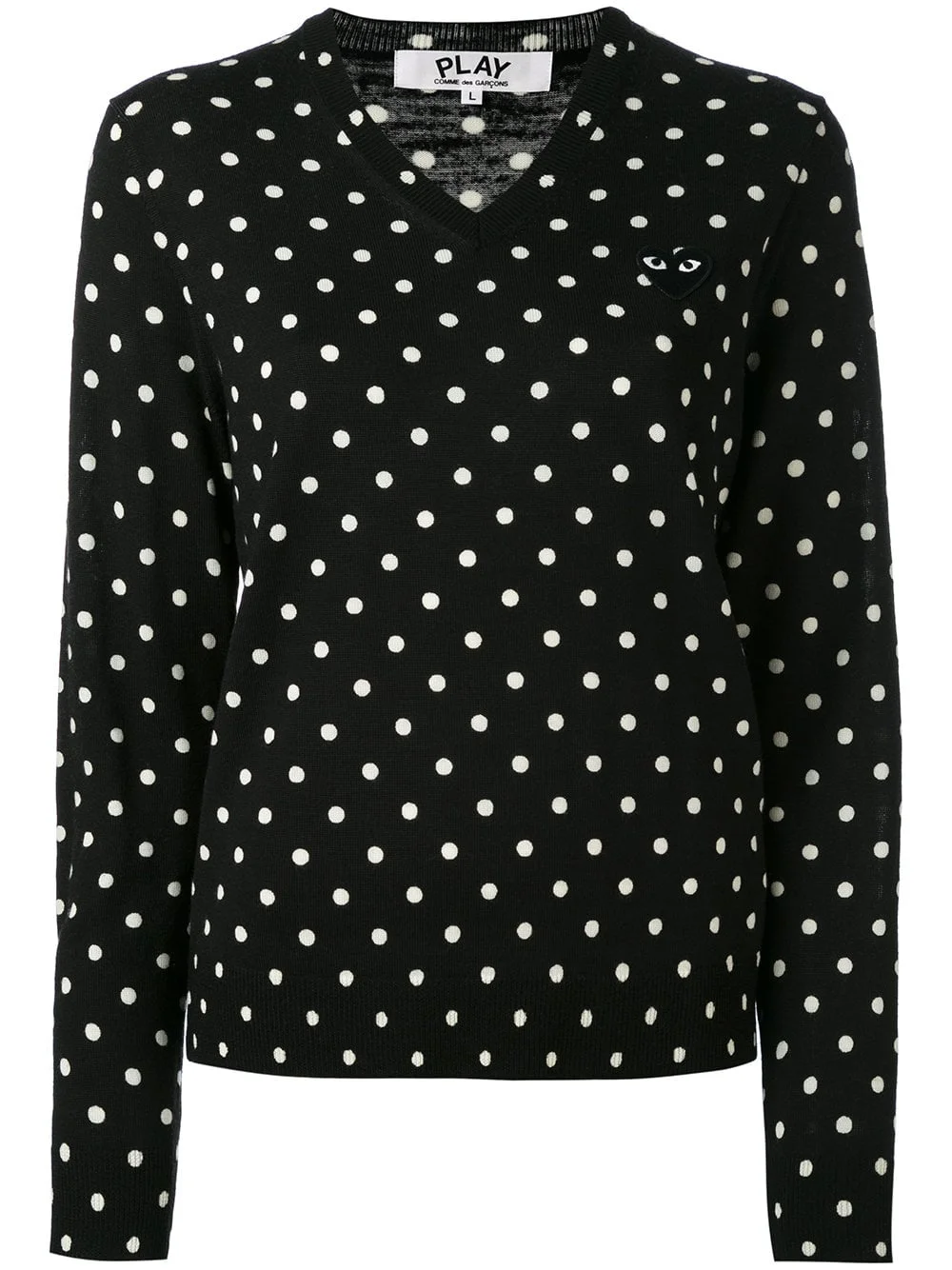 Black Wool Pullover with White Polka Dots from Comme des Garcons Play. Featuring a Black Embroidered Heart, V-Neck and Front Button Fastening. This Item Runs Small, Therefore We Recommend Taking One Size Up. Designer ID: P1N035