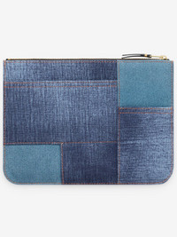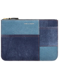 SA5100DP Denim Pocket Wallet in Blue Denim Comme des Garcons Wallet Highlights - blue - leather - denim patchwork design - gold zip fastening - one main compartment - 215mm x 160mm Made in Spain Designer ID: SA5100DP Materials LAMBSKIN 100%