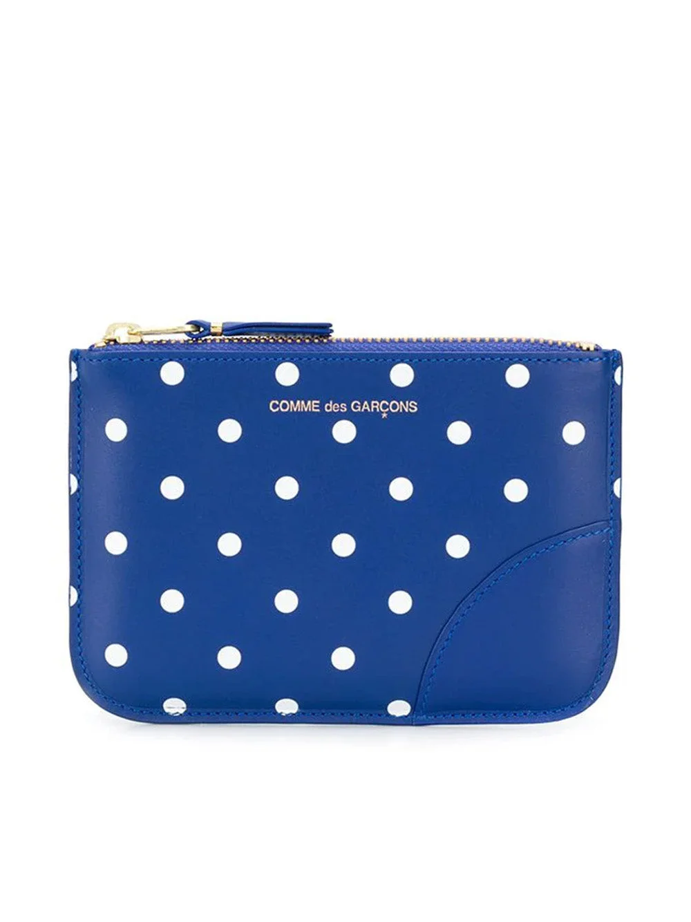 SA8100PD Wallet in Printed Polka Dots Navy from Comme des Garcons Wallet Highlights - blue - white polka dots - gold embossed logo - zipper closure - one main compartment Made in Spain Composition: 100% Leather Designer ID: SA8100PD Product Measurement Length: 15 cm Width: 10 cm Thickness: 1.5 cm Materials 100% Cowhide For surface stains, we recommend wiping with a damp cloth.