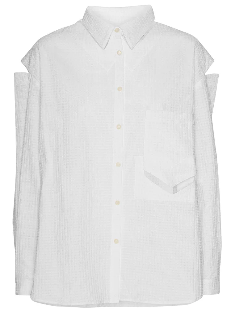Cut Out Shirt in White from Henrik Vibskov's SS25 Key Collection Highlights - white - grid textured material - collar - long sleeves - front button closure - cut out design Model is 177cm tall and wears a size S Made in Bulgaria Designer ID: SS25KEY-F203 Colour ID: 101 White Materials 97% Organic Cotton 3% Elastane