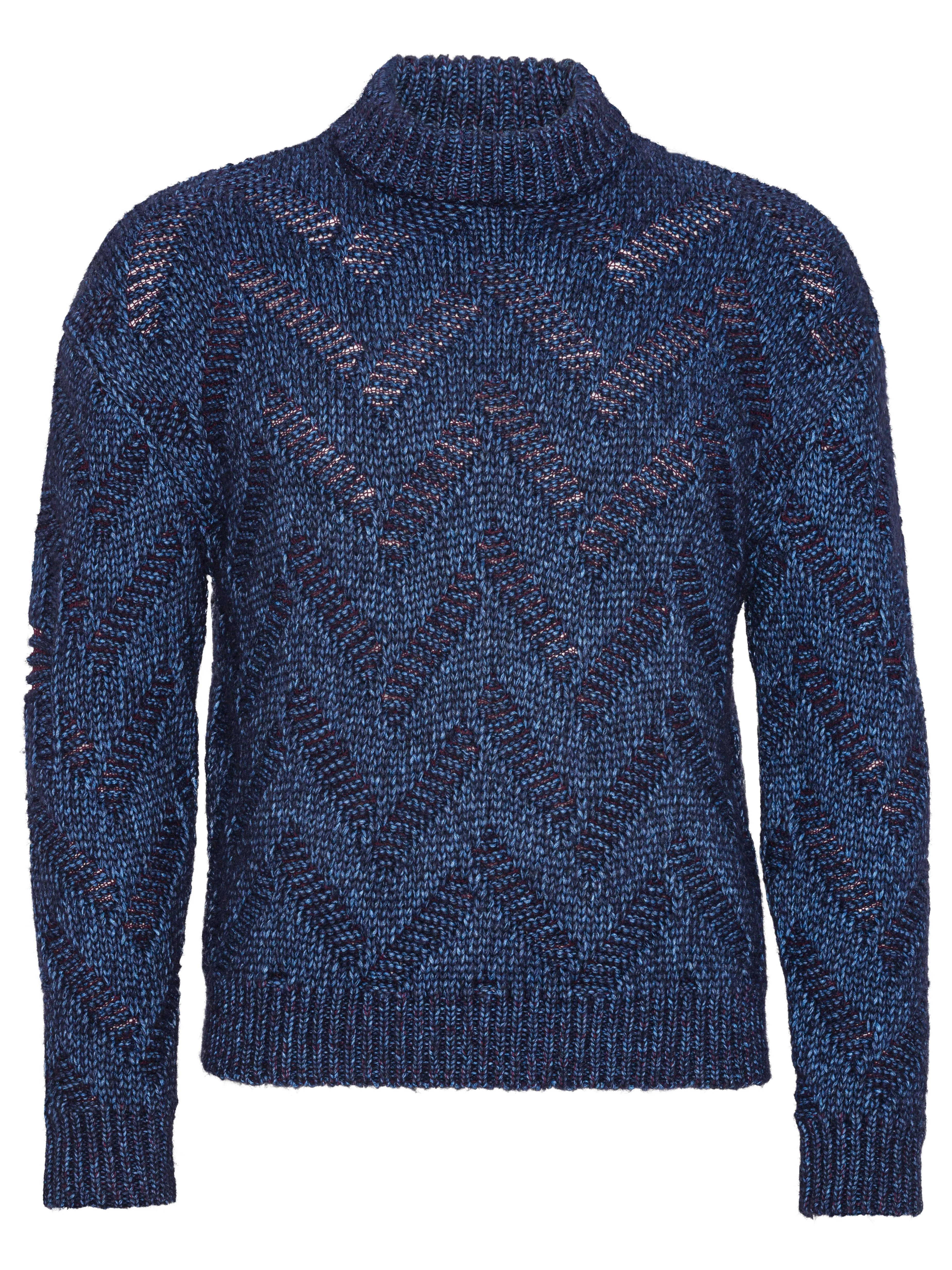 Flat Knitted Crewneck in Flat Navy from Henrik Vibskov's Autumn Winter 2025 Studio collection "A Bit Overwhelmed by the Opaque Resonance" Highlights - navy - high neck - fishbone pattern - long sleeves - ribbed hem Model is 187cm tall and wearing a size M Made in Bulgaria Designer ID: AW25STUD-M705 Colour ID: 778 Flat Navy Materials 100% New Wool