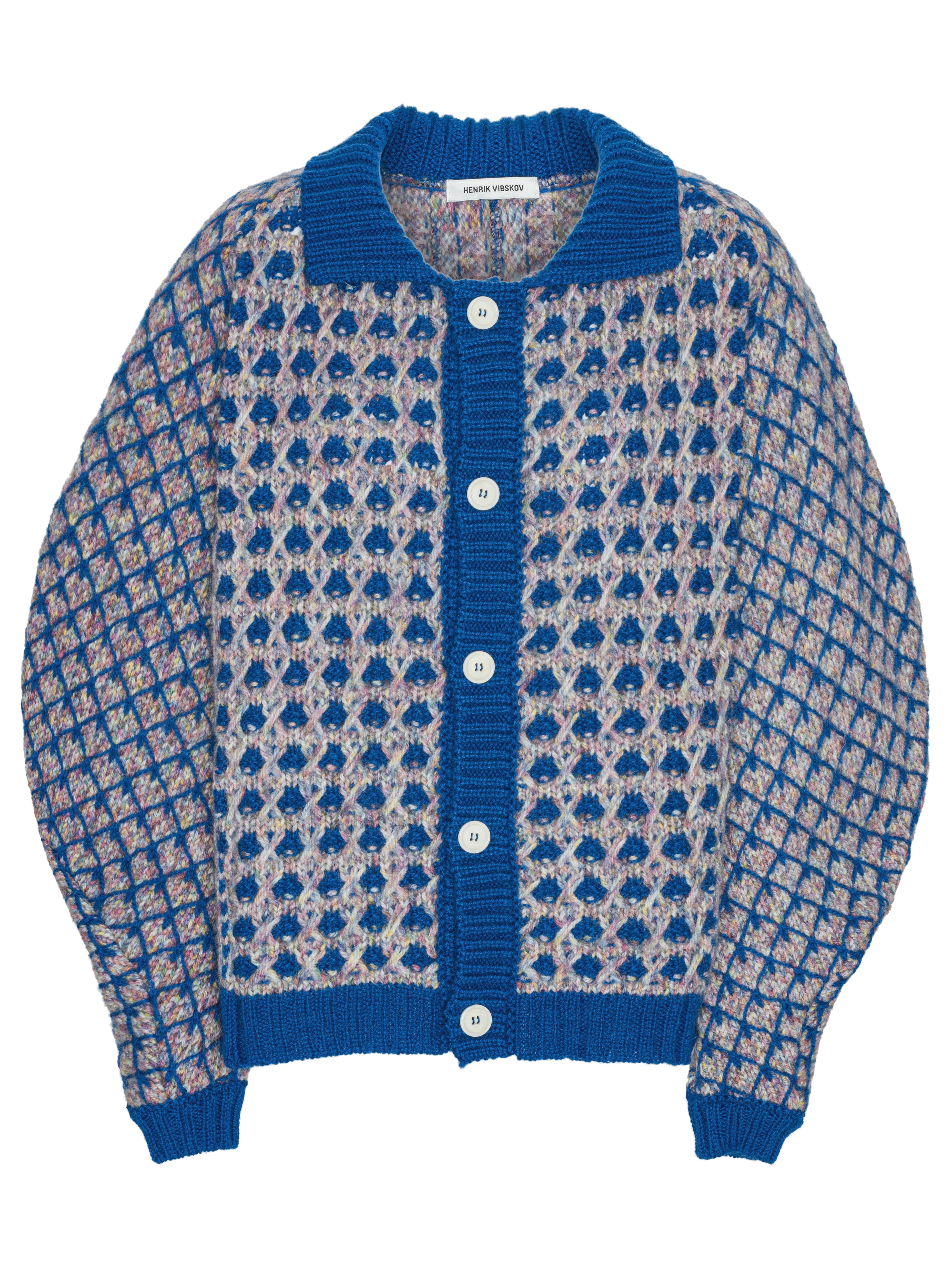Kimchi Cardigan in Blue Party Bubble from Henrik Vibskov's Autumn Winter 2025 Studio collection "A Bit Overwhelmed by the Opaque Resonance" Highlights - blue - mix check pattern - collar - front button closure - round sleeves - loose fit - ribbed hems Model is 182cm tall and wearing a size M Made in Bulgaria Designer ID: AW25STUD-M711 Colour ID: 769 Blue Party Materials 100% Norway Wool