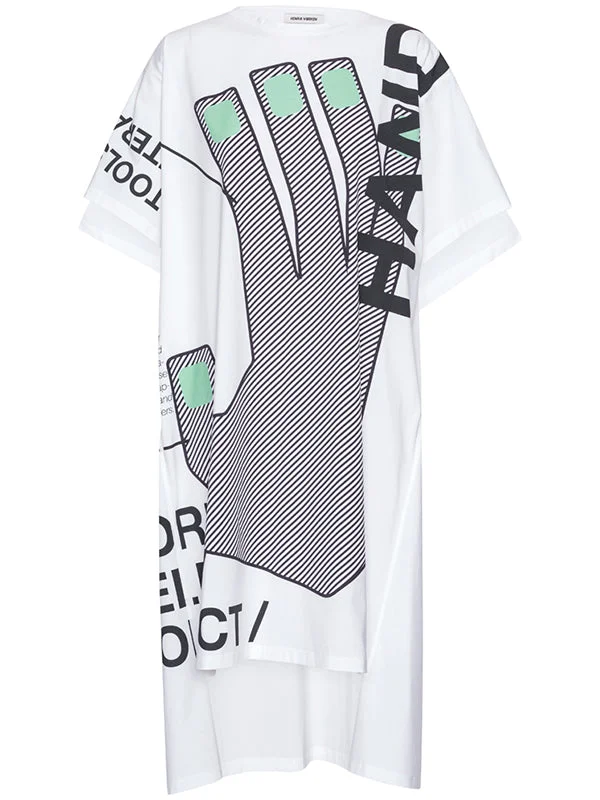 Knuckle Long Tee in Hand Tools from Henrik Vibskov's SS25 Studio Collection 'The Orchestra of the Soft Assistance' Highlights - white, black and green - long t-shirt design - abstract cut - short t-shirt sleeves - abstract print - under knee length The model is 178 cm and is wearing a size small Made in Denmark Designer ID: SS25STUD-F801 Colour ID: 172 Hand Tools Materials 91% Organic Cotton 9% Elastane