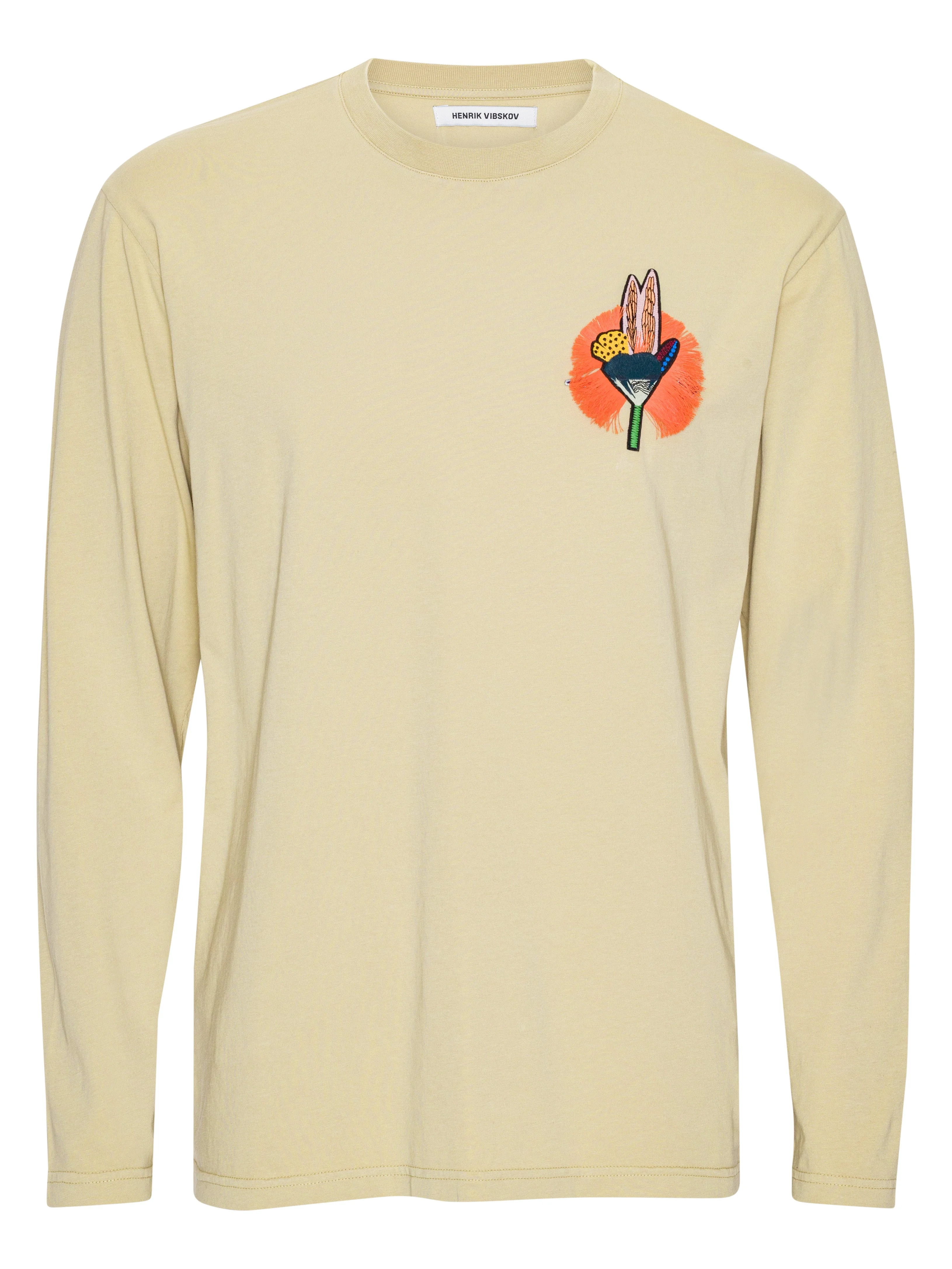 Slopes Longsleeve in Mojave from Henrik Vibskov's Autumn Winter 2025 Studio collection "A Bit Overwhelmed by the Opaque Resonance" Highlights - off white - round neck - long sleeves - feather patch on chest - straight hem Model is 187cm tall and wearing a size M Made in Portugal Designer ID: AW25STUD-M805 Colour ID: 541 Mojave Materials 100% Organic Cotton