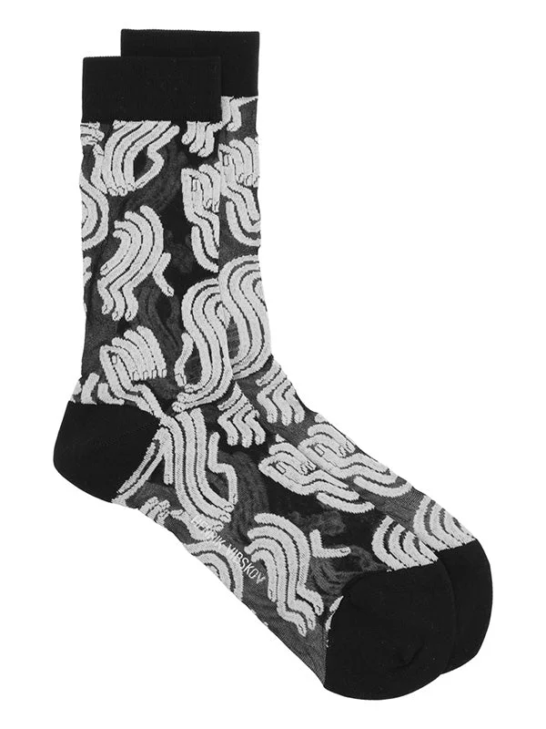 Sunny Fingers Transparent Socks Femme in White Fingers Black from Henrik Vibskov's SS25 Studio Collection 'The Orchestra of the Soft Assistance' Highlights - black and white - semi-transparent material - abstract finger print - ribbed hem - mid length socks - one size Made in Portugal Designer ID: SS25STUD-S916 Colour ID: 998 White Fingers Black Materials 100% Polyamide