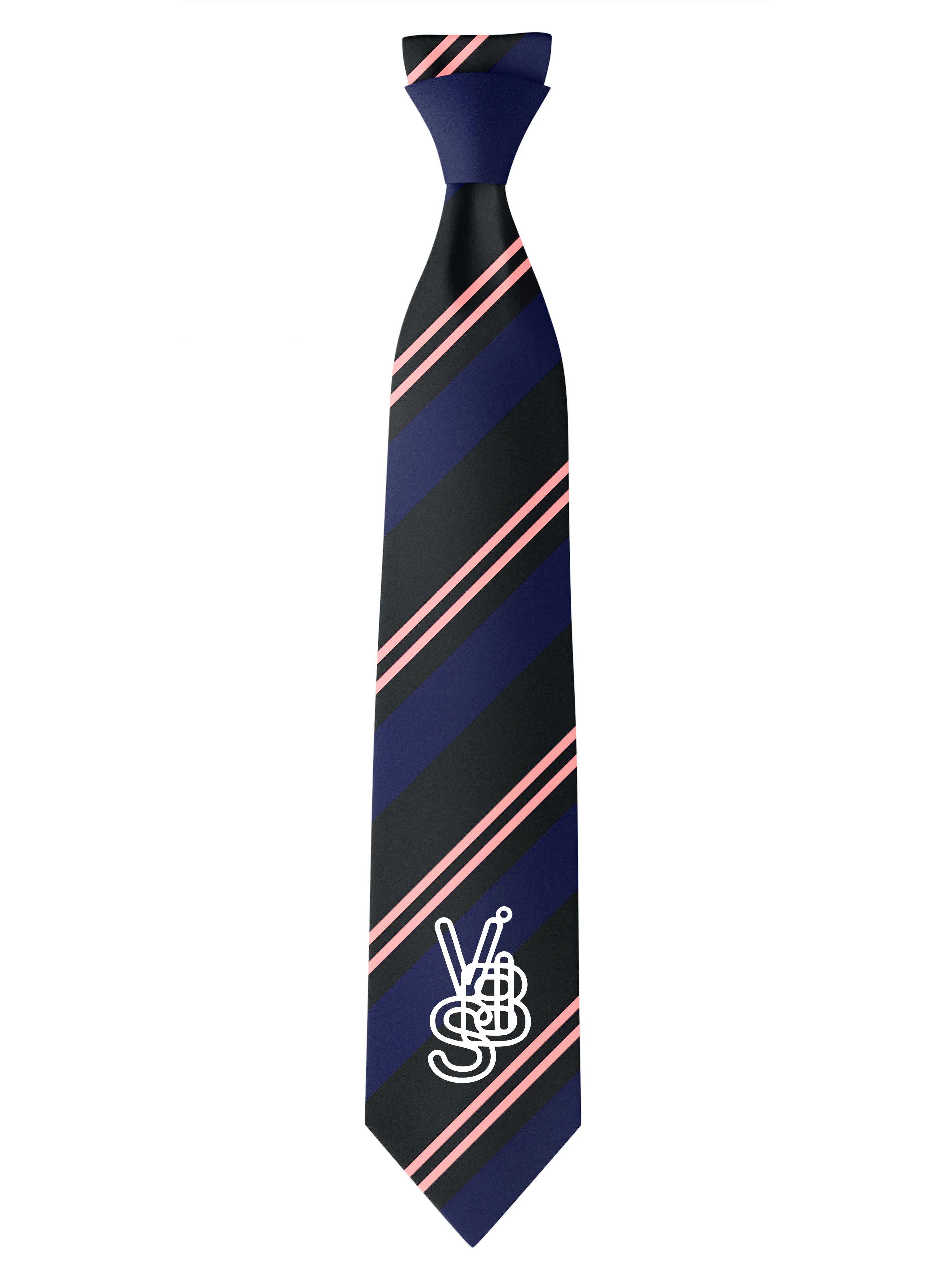 Vibs Tie in White Vibs from Henrik Vibskov An extension from his Spring Summer 2026 collection 'Everything Cracks Eventually - I’ll Be Gentle' Highlights - black, navy, pink stripes - classic tie - chicken head embroidered Made in United Kingdom Designer ID: SS26STUD-A904804OS Colour ID: 804 White Vibs Materials 100% Recycled Polyester