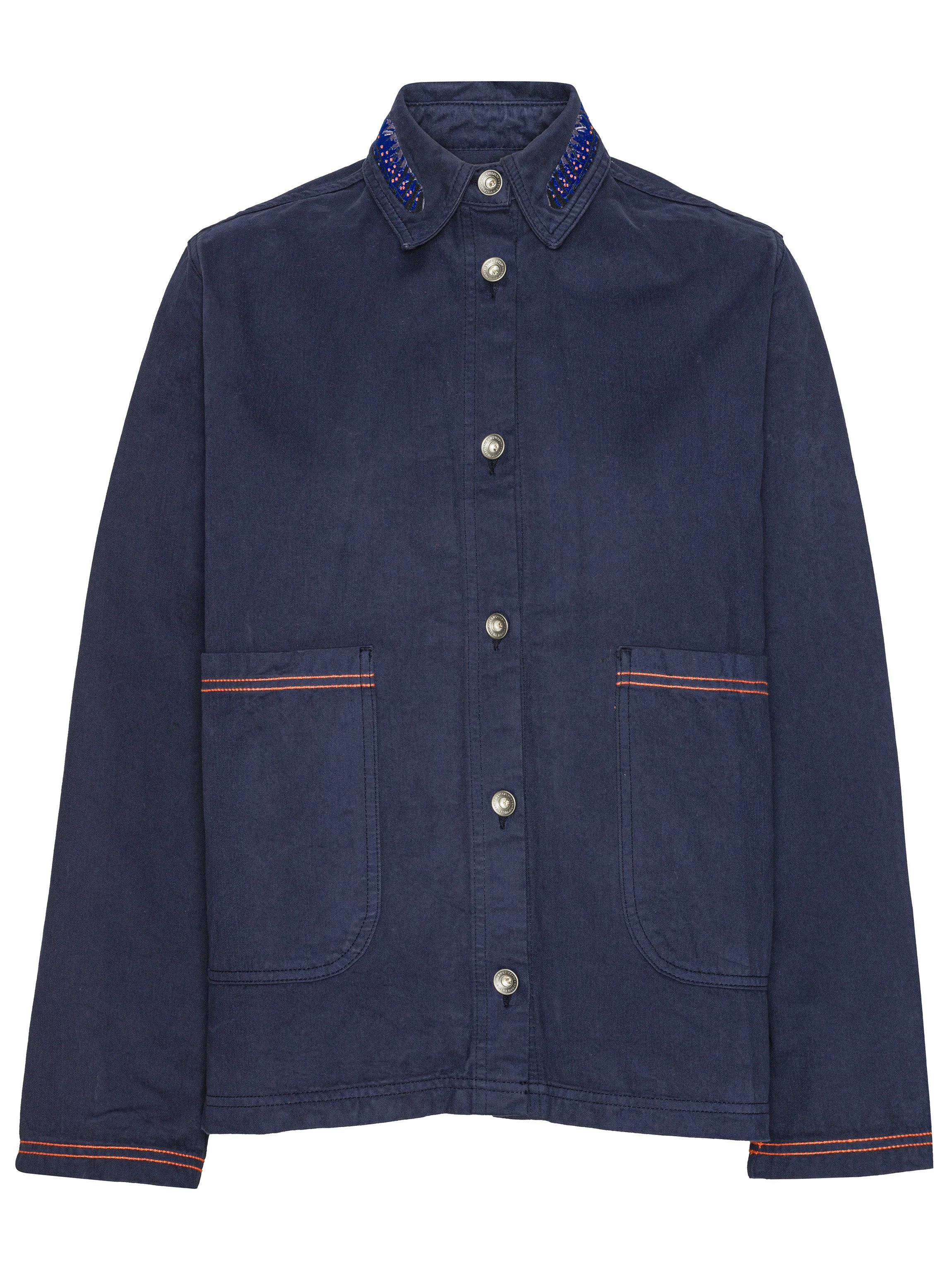 Wheel Work Shirt in Peacoat from Henrik Vibskov AW25 Key Collection Highlights - dark blue - orange contrast stitching - collar - front button closure - front patch pockets Model is 181cm tall and is wearing a size S Made in Portugal Designer ID: AW25KEY-F601 Colour ID: Peacoat Materials 100% Organic Cotton