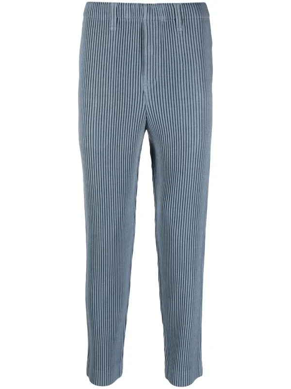 AW23 Slim Fit Pants in Blue from Issey Miyake Homme Plisse Highlights - blue - fully pleated - elasticated waistband - slim cut - slim fitted leg - two side slit pockets - belt straps Made in Japan Composition: 100% Polyester Designer ID: HP38FF307 Color ID: 72
