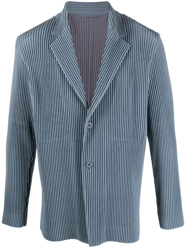Pleated Jacket in Blue from Issey Miyake Homme Plisse Highlights - blue - jacket - long sleeves - straight hem - revers - buttoned down in front Made in Philippines Composition: 100% Polyester Designer ID: HP38FD305 Color ID: 72-Blue