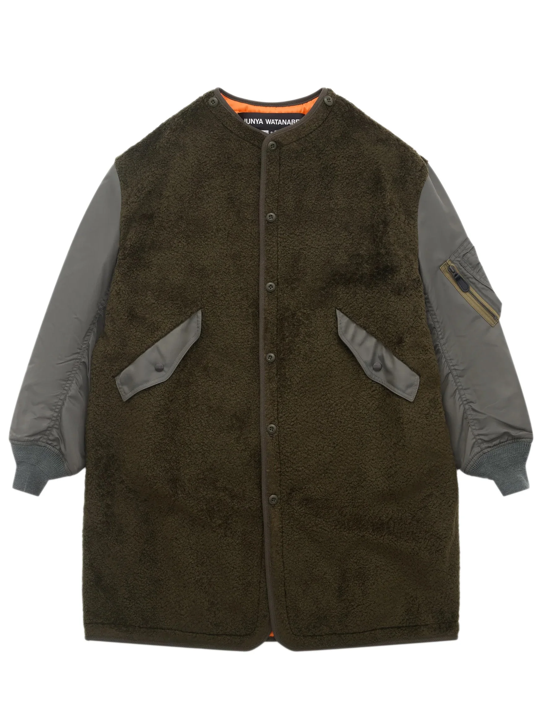 Ladies' Jacket in Khaki and Sage Green from Junya Watanabe Highlights - khaki and sage green - round neck - button fastening - press stud flap pockets - fleece body - contrast lining - wadded - classic bomber jacket sleeves and rear panel Made in Japan Designer ID: JP-J015-W25 Materials PILE: ACRYLIC 100% BASE: PAN 55% PL 45% X NY 100%