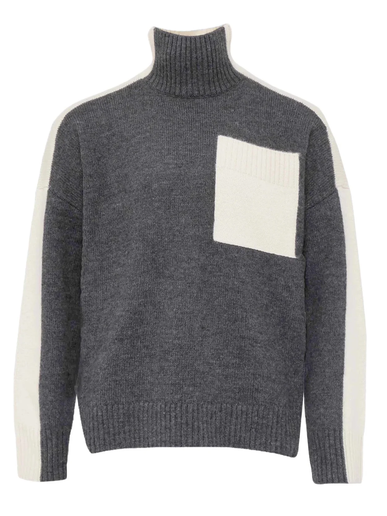 Two Tone Patch Pocket Jumper in Grey from J.W. Anderson Highlights - grey and white - two-tone design - turtleneck - front patch pocket - oversized design - ribbed hems Made in China Designer ID: KW1402 Colour ID: 929 GREY Materials 44% SHEEPS WOOL 38% ALPACA WOOL 18% ACRYLIC