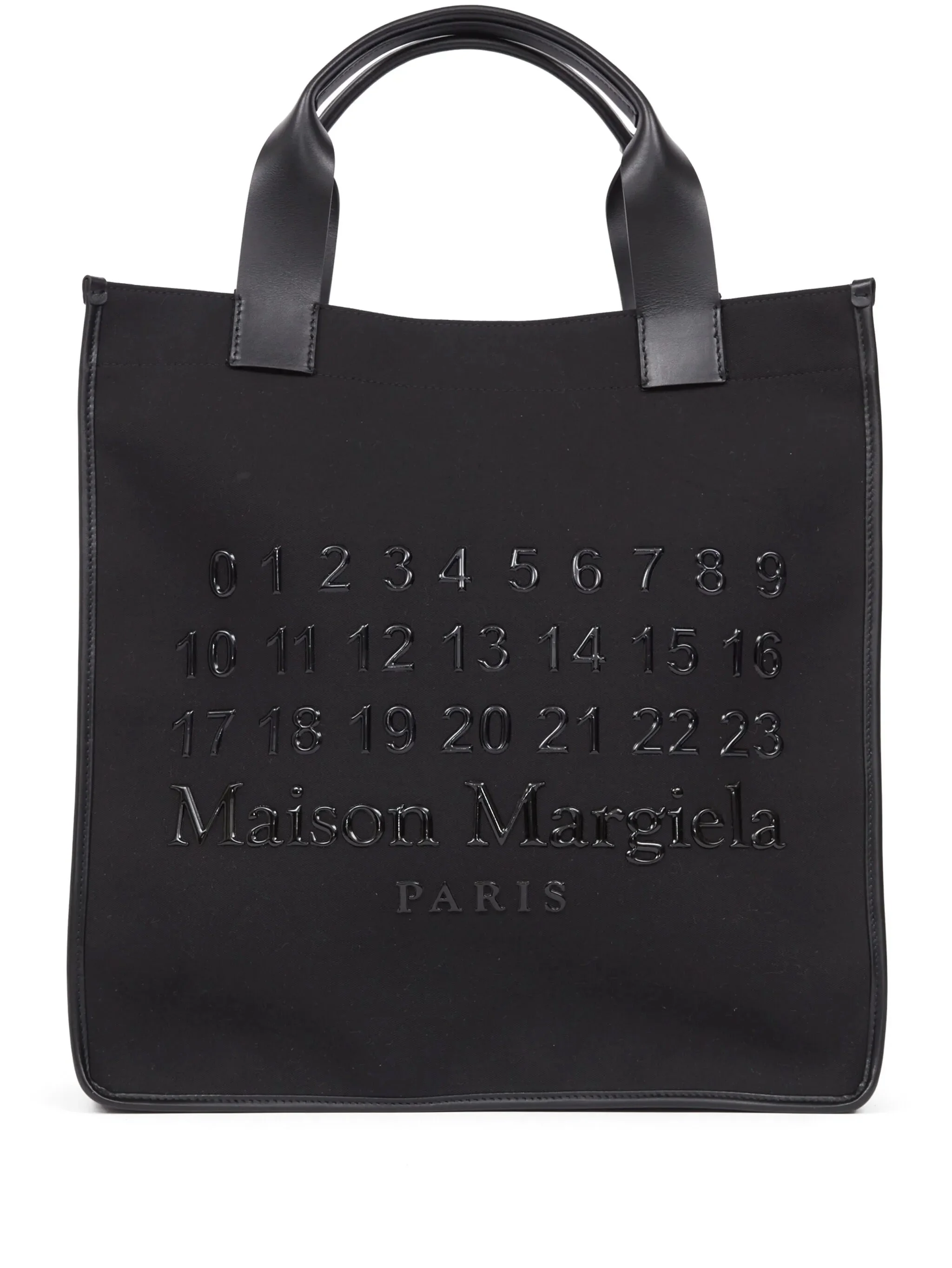 Cabas Shopping Bag Vertical in Black from Maison Margiela Highlights - black - one main compartment - internal zip pocket - magnetic closure - removable shoulder straps - embossed logo on the front - twill weave Made in Italy Designer ID: SB1WC0019P7276 Colour ID: HA200 Black/Black Materials Body: 65% Polyester, 35% Cotton Contrast: 100% Calf Leather Application: 100% Polyurethane Lining: 100% Cotton Lining: 100% Calf Leather Metallic Parts: 100% Brass