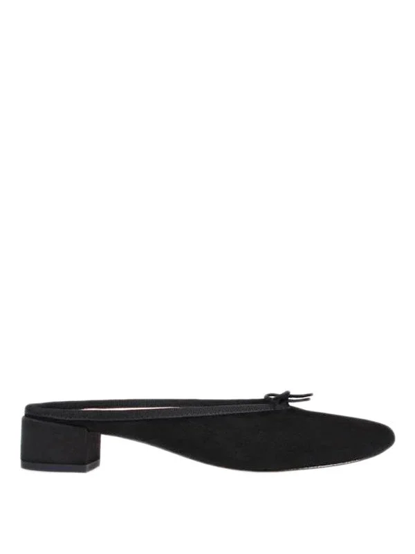 Camille Mules in Black from Repetto Highlights - black - suede - slip-on design - 3cm block heel - bow detail Made in France Designer ID: V4183CV Colour ID: 410 - Noir Materials 100% GOAT SUEDE UPPER 100% COTTON LINING 100% CALFSKIN INSOLE 100% SPLIT LEATHER SOLE