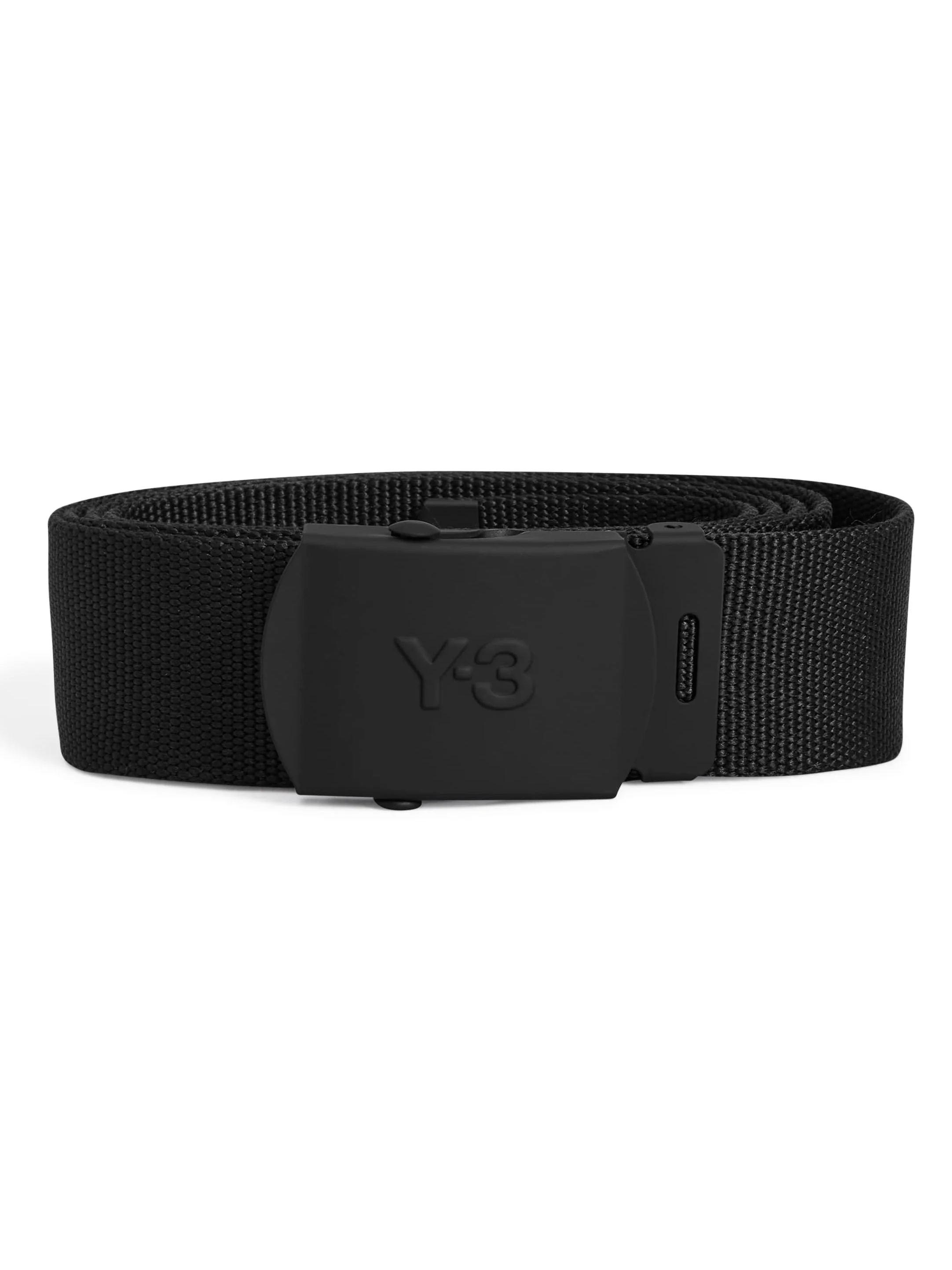 Y-3 Classic Logo Belt in Black from Y-3 Highlights - black - durable jacquard webbing - minimalist metal buckle - embossed Y-3 logo on buckle - versatile everyday accessory The Y-3 Classic Logo Belt combines functional design with signature Y-3 style. Made from sturdy jacquard webbing, it ensures durability for daily wear, while the minimalist metal buckle, embossed with the Y-3 logo, adds a refined designer touch. A versatile accessory, this belt effortlessly elevates both casual and polished looks. Made in China Designer ID: KA2308 Colour ID: Black Materials 100% Polyester
