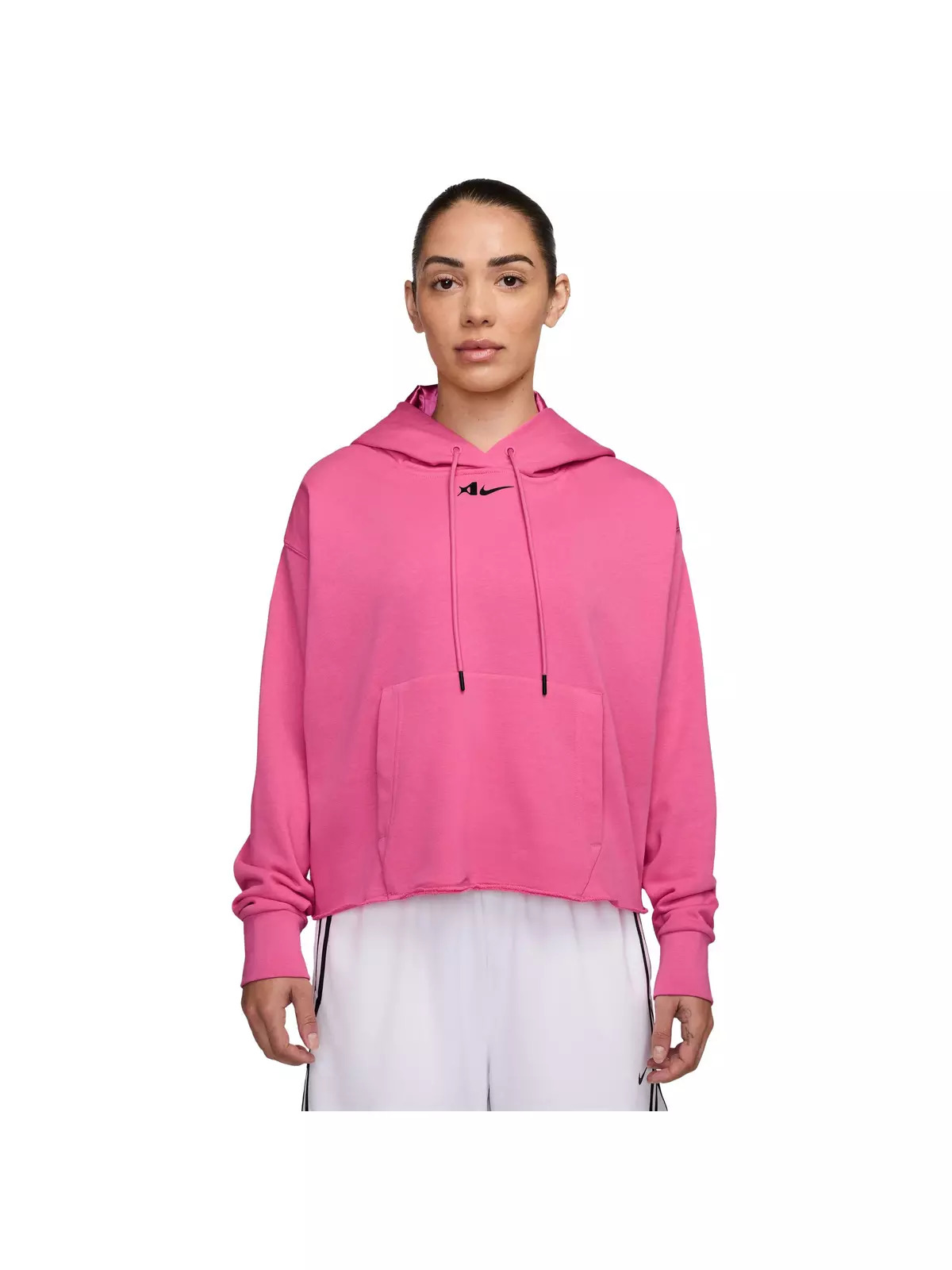 - Luxe look in this basketball hoodie. - Lined with premium material that has a silky feel and luxurious sheen. - Built around the star, it’s strong, bold and playful—just like the energy A’ja brings to the court. - Body fabric blends 80% cotton and 20% polyester; hood lining is 100% polyester. - Provides secure storage with easy access. - Allows adjustable coverage. - Machine washable.