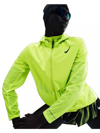 - Nike Storm-FIT technology resists elements like wind and water to help keep you comfortable in harsh weather conditions. - Nike Aerogami technology creates on-demand airflow with tiny winged vents, which open when sweat builds and close when sweat evaporates, to help you stay dry and comfortable. - Zippered side pockets help you store your small valuables. - Adjustable bungee cords at the hood and hem help you personalize your fit. - Elastic cuffs - Full-zip - Cord lock on front and back of hood - Body: 100% polyester. Mesh: 82% polyester/18% spandex. - Machine wash - Imported