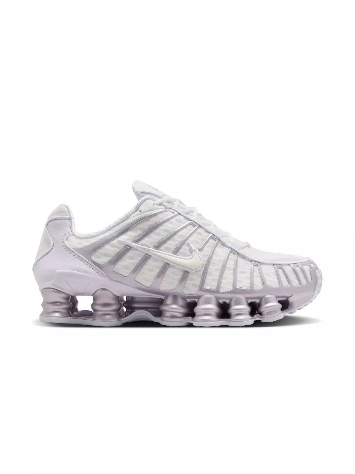 - Combines resilient, flexible columns and moderator plates that deliver outstanding cushioning while compressing and regaining shape. - Near-exact replica of the 2003 Nike Shox TL in Summit White/Sail/Barely Grape. - Support midfoot structure and ensure a snug fit. - Heel-mounted plate supplying lateral stability and additional support. - Synthetic and textile construction maintains durability and breathability. - Rubber compounds enhance grip and longevity. - Not intended as protective gear.